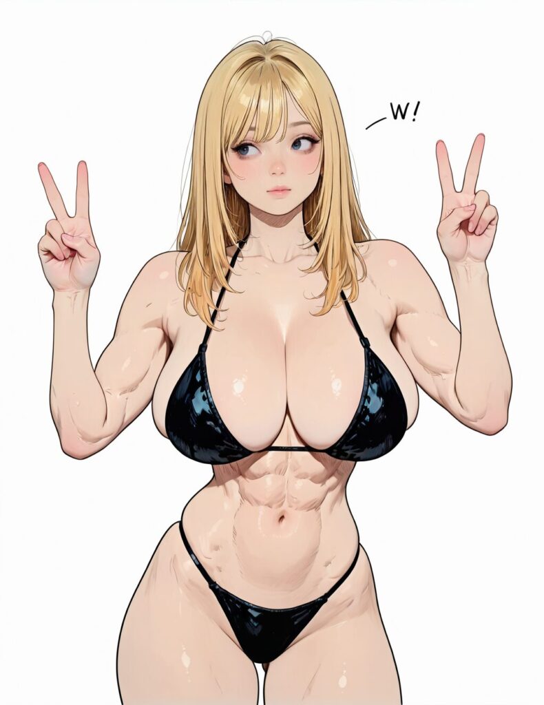 1girl, muscular, bikini, shoulder, cowboy shot, huge breasts, blond hair, v, peace sign white background, (masterpiece, best quality, amazing quality, highres) <lora:shoulder_width:-2>
