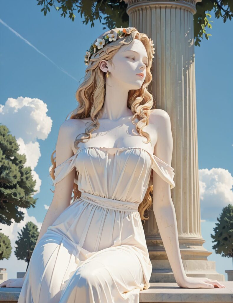good shadows, very awa, masterpiece, best quality, amazing quality, absurdres, very aesthetic, slim fit,, NM_Antiquity_statue, statue, 1girl, solo, long hair, breasts, blonde hair, dress, closed mouth, jewelry, bare shoulders, sitting, medium breasts, collarbone, closed eyes, flower, outdoors, earrings, sky, day, cloud, white dress, off shoulder, blue sky, tree, lips, wavy hair, arm support, pale skin, head wreath, statue, greco-roman clothes <lora:NM_Antiquity_statue_ill:1>