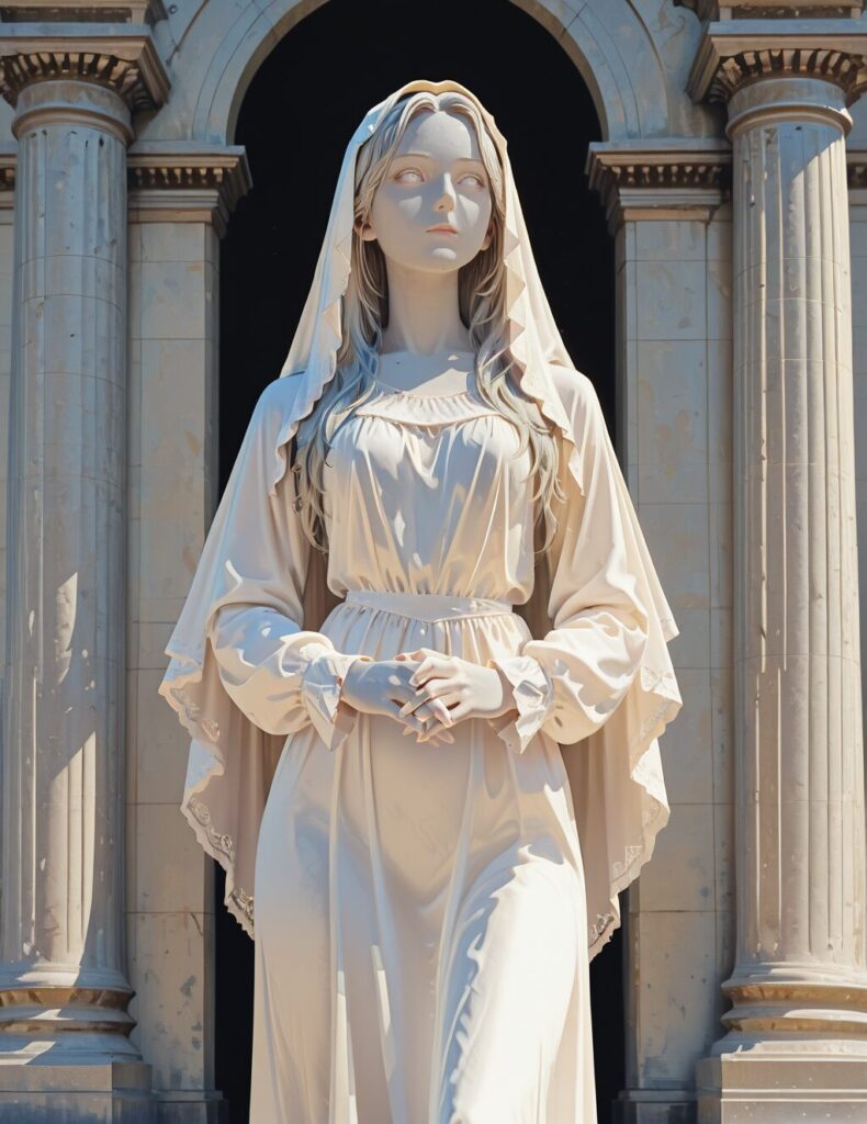 good shadows, very awa, masterpiece, best quality, amazing quality, absurdres, very aesthetic, slim fit, , NM_Antiquity_statue, statue, 1girl, solo, long hair, long sleeves, dress, closed mouth, standing, white dress, own hands together, veil, white eyes, pillar, statue <lora:NM_Antiquity_statue_ill:1>