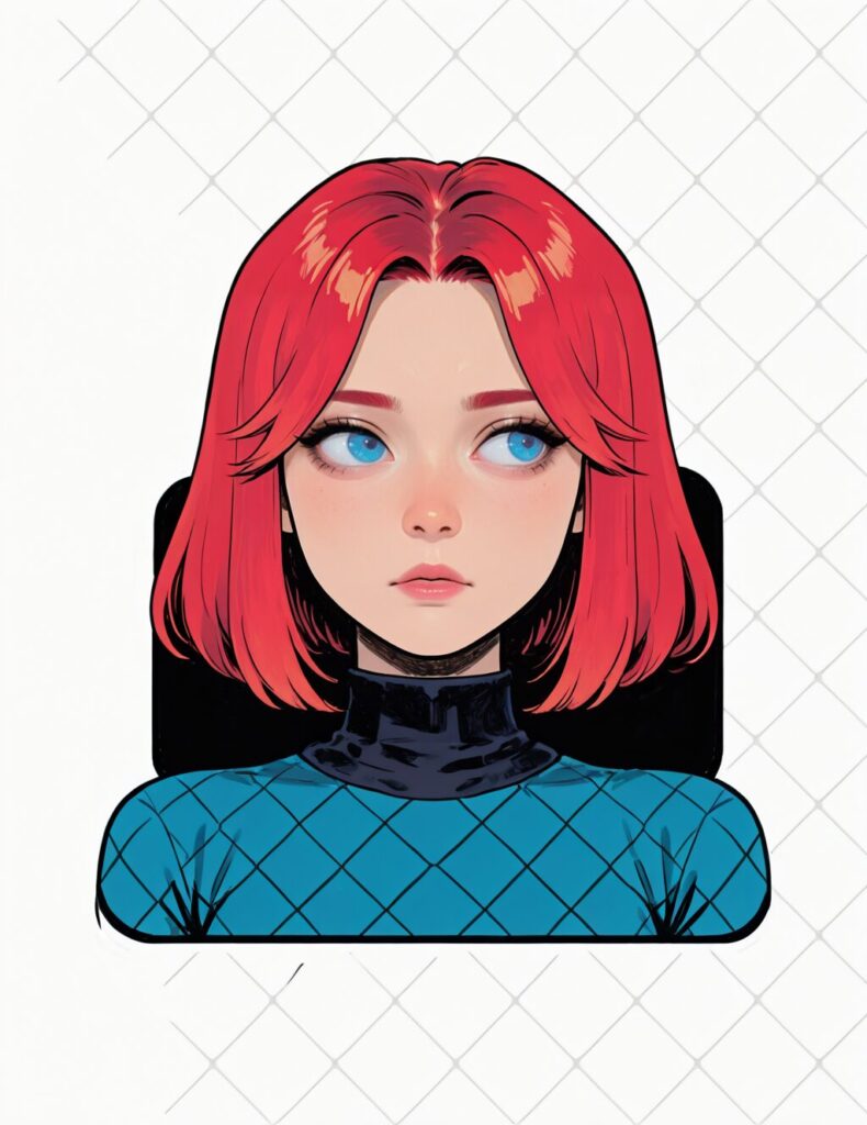 Emoteclash,frame,outside the frame, white background, simple background, argyle background,inside on the frame, <lora:Emote:1>, 1 girl, red hair, blue eyes,