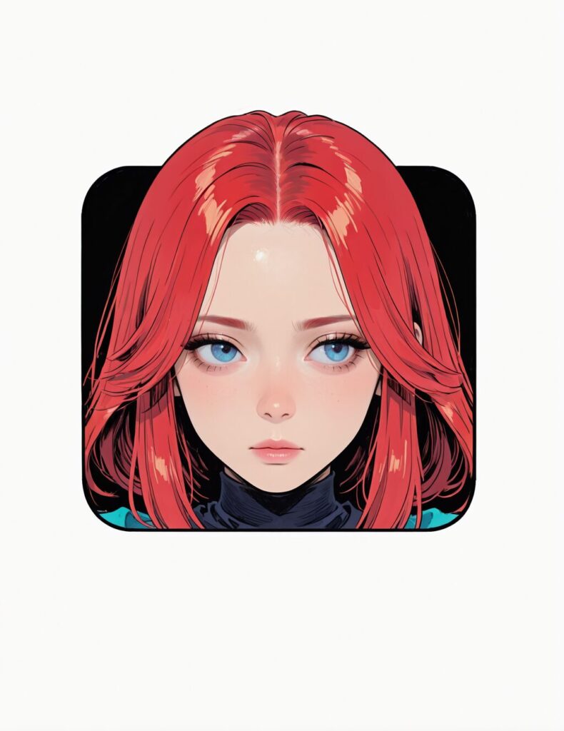 Emoteclash,frame,outside the frame, white background, simple background, inside on the frame, <lora:Emote:0.5>, 1 girl, red hair, blue eyes,