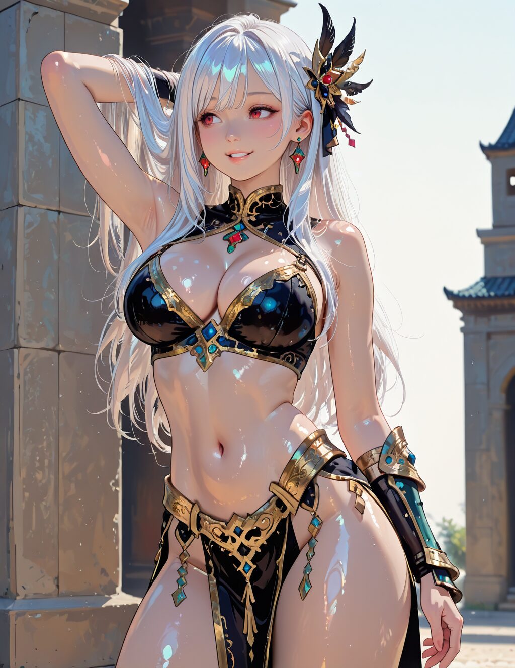 1girl, solo, revealing clothes, navel, long hair, pelvic curtain, breasts, red eyes, thighs, stomach, parted lips, arm up, jewelry, bare shoulders, white hair, earrings, armpits, cowboy shot, shiny skin, hair ornament, armor, shiny, cleavage, smile, standing, large breasts, gold trim <lora:checkpoint-e18_s360:1>