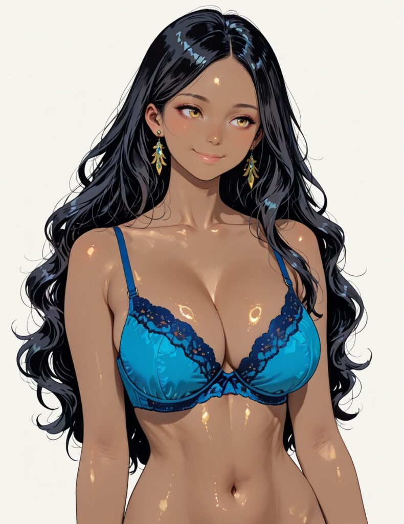 1girl, breasts, dark skin, solo, dark-skinned female, earrings, bra, jewelry, underwear, long hair, navel, cleavage, black hair, large breasts, collarbone, blue bra, yellow eyes, bare shoulders, closed mouth, shiny, shiny skin, parted bangs, forehead, bangs, stomach, wavy hair, smile <lora:checkpoint-e18_s360:1>