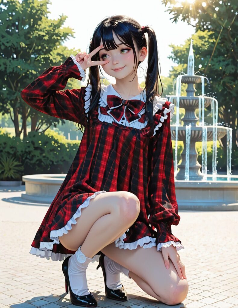 embedding:lazypos,masterpiece,best quality,amazing quality, flat_color, 1girl,solo, black_hair,twintails,long_hair, high tails,green_eyes,small_breasts, plaid short dress,white collar,red and black plaid,plaid chest bow,white frills,long plaid sleeves,sleeves over wrist, full_body,bare_legs,white_socks,black pumps, kneel on one knee,looking_at_viewer,smile,v_over_eye,hand on knee, outdoors,fountain square,sunlight, <lora:cute plaid short dress08300408346ilt:0.8>