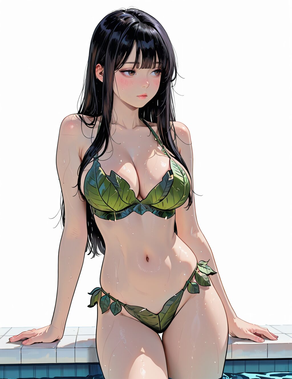 masterpiece, best quality, amazing quality, 4k, very aesthetic, high resolution, ultra-detailed, absurdres, leaf underwear, 1girl, solo, navel, cleavage, looking at viewer, blush, large breasts, bare shoulders, long hair, swimsuit <lora:Leaf_Underwear_PDILV2:0.8>