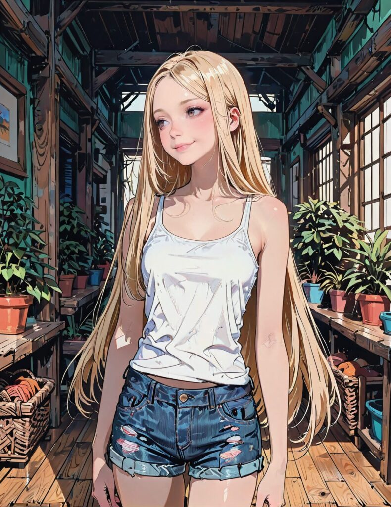 hand_draw, manga_style, 1girl, solo, dynamic lighting, full_body_shot, ash_blonde_hair, extreme_long_hair, faux_hawk, long_hair, standing, caressing her own body, white_tank_top, short_denim_shorts, detailed_scenario_background, (traditional_Southeast_Asian_stilt_house, wooden_floor, woven_basket, potted_plant), soft_gaze, relaxed_expression, subtle_smile, gentle_touch,<lora:Hand_Draw_Manga_Style:0.8>