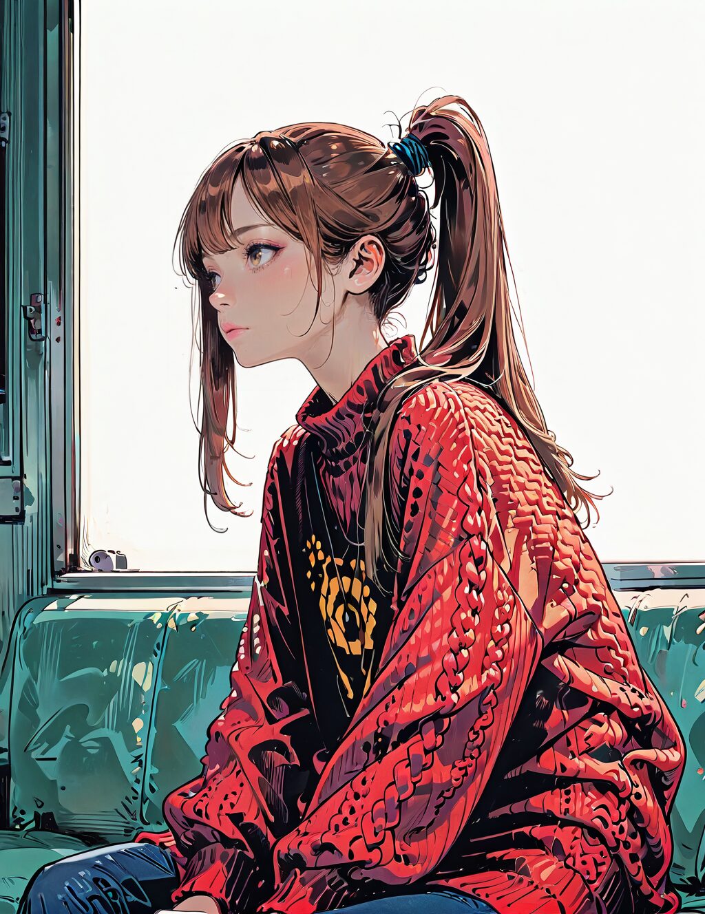 hand_drawn, manga_style,1girl,solo,hazel hair,long_hair, high ponytail,sitting, sweater, chinos,dam BREAK lazypos, <lora:Hand_Draw_Manga_Style:1>