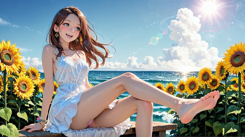 masterpiece, best quality, original, anime_coloring, 1girl, :d, bare_legs, blush, bracelet, brown_hair, dress, earrings, floating_hair, flower, foot_out_of_frame, green_eyes, jewelry, legs, lens_flare, long_hair, ocean, open_mouth, panties, pantyshot, pink_panties, short_dress, sideboob, sleeveless, sleeveless_dress, smile, soles, solo, summer, sundress, sunflower, underwear, white_dress, yellow_flower <lora:3xtr3m3_res:0.5> 3xtr3m3_res