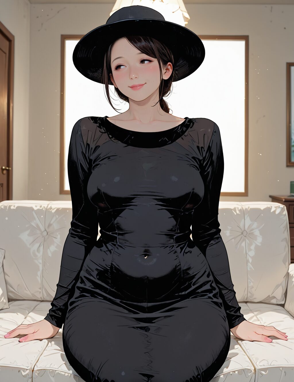 masterpiece, best quality, 1girl, sitting, black dress, black hat, indoors, smile, small breasts, NO_LORA