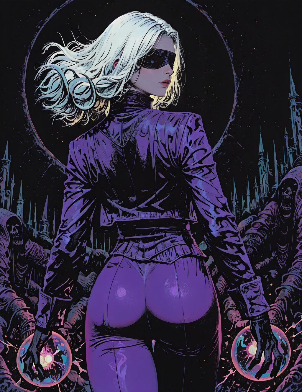 white hair blindfold, covered eyes, black blindfold, purple pants, high collar, purple jacket, from behind, energy ball, 1boy, solo, alone, monster,, dark_fantasy_illustration, masterpiece, highres <lora:dark_fantasy_illustration_illustriousXL:0.8>