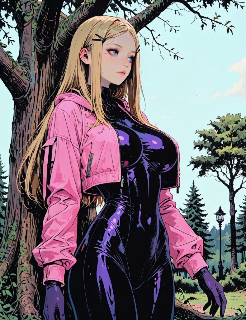 blonde hair, long hair, blue eyes, mole under right eyes, slim waist, large breast, pink jacket, purple bodysuit, hairclip, 1girl, solo, alone, tree, dark_fantasy_illustration, masterpiece, highres <lora:dark_fantasy_illustration_illustriousXL:0.5>