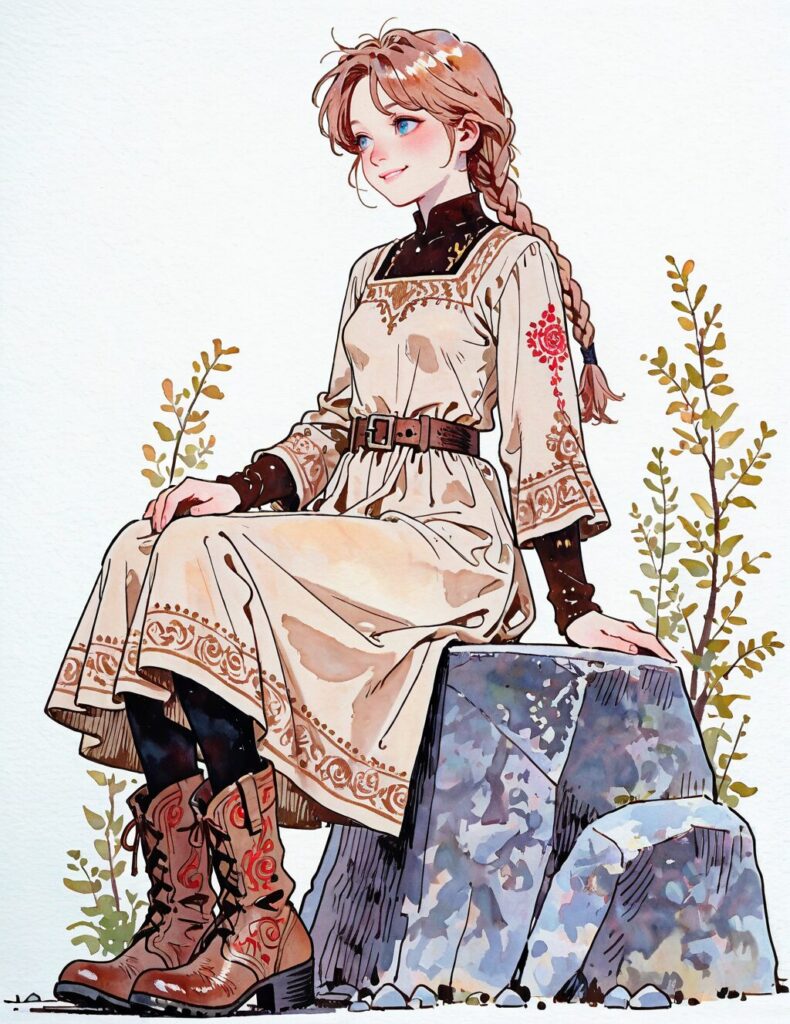 (((sketch art))) portrait of one young (((beautiful hunter woman))) (((wearing (light-brown warm woolen dress with red embroidery) and (brown long buckskin pants)))), (((high Fur boots))), (long sleeves), (leather belt), ((proud)), ((suspicious stare)), (showing off), ((sitting on a stone)), ((beautiful detailed face, small nose, big blue eyes)), (((perfect firm small breasts))), strong muscular ((slim beautiful athletic body)), (wild look), (((chestnut hair))), ((long braid)), ((happy smile)), sketch, ((soft watercolour shading)), traditional media, transparent-watercolor, watercolor \(medium\), (((simple snowy watercolour background)))<lora:transparent-watercolor_IL_MIX:1.2>