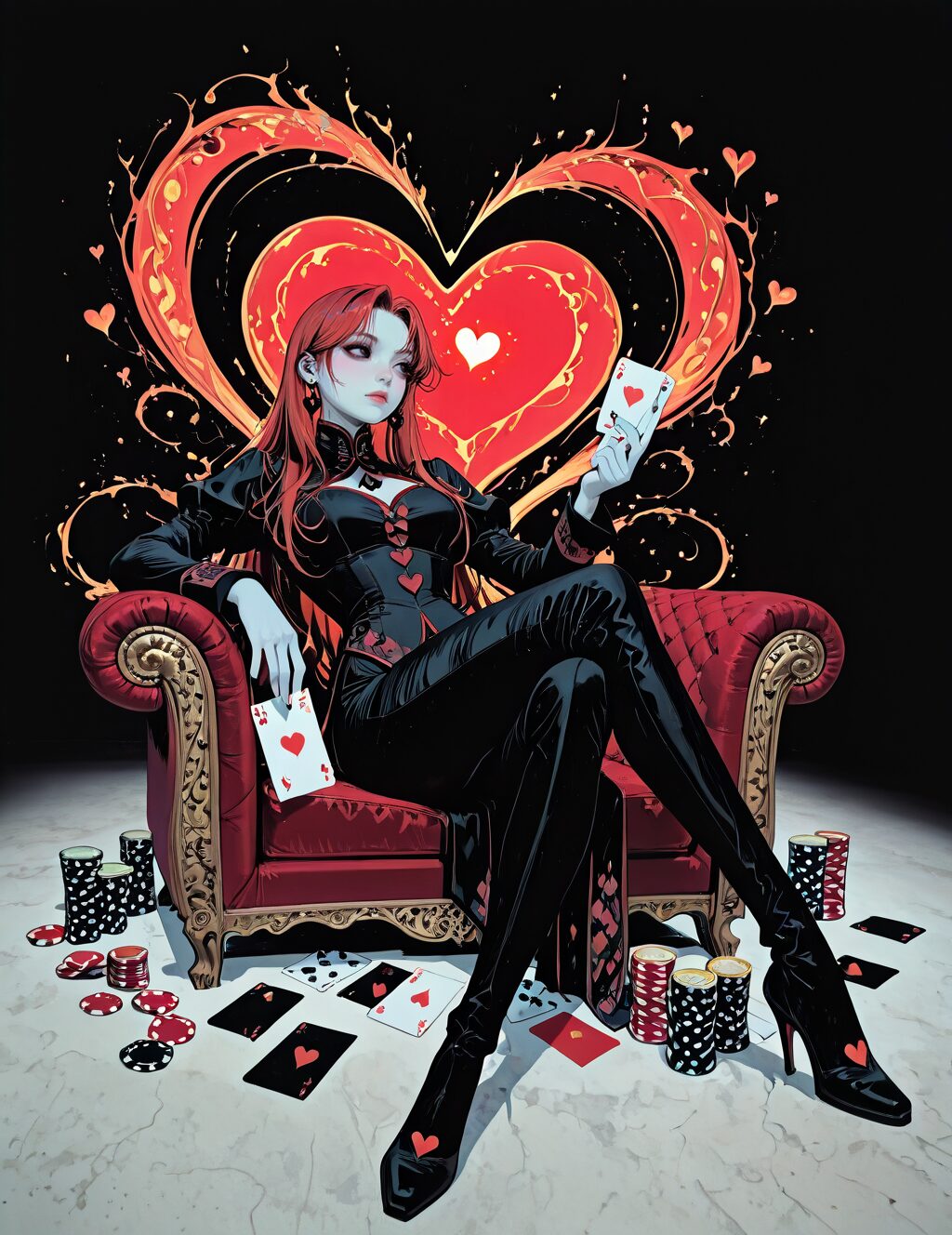 Female, PG, Physical characteristics: Elegant facial features, pale skin, striking dark eyes, flowing red hair composed of heart shapes, full body, full body shot Clothing and accessories: Red, heart-shaped elements enveloping her body and head; intricate earrings visible, Position: Reclining or emerging from the playing card, with one hand extended gracefully, Background: Dark backdrop with smoky, ethereal effects, scattered red hearts and poker chips enhancing the thematic composition, Main element: Queen of Hearts playing card, creatively designed with a vivid, surreal touch, Art style: Hyper-realistic with fantasy elements, emphasizing red tones and a luxurious, dramatic atmosphere <lora:Mix_Style:1>