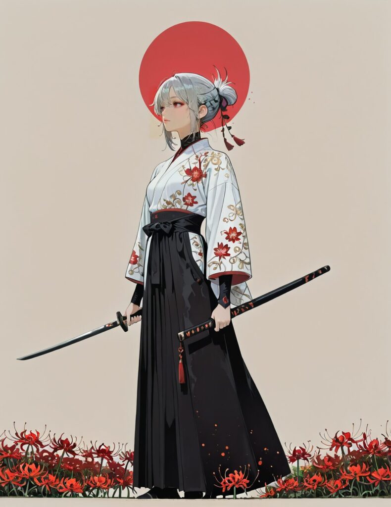 masterpiece, best quality, high res, perfect lighting, absurdres,1girl, Beautiful female samurai in artistic Japanese illustration style, silver-gray hair with red inner color flowing elegantly, wearing white kimono with black hakama, intricate red spider lily flowers decorating outfit, holding katana sword at diagonal angle, large red circle sun motif in background, minimalist beige background with ink splatter effects, vertical red line dividing composition, delicate floral branches intertwining with clothing, traditional Japanese aesthetics mixed with modern anime art style, ethereal and graceful warrior pose, monochromatic color scheme with red accents,,Anime screencap,masterpiece, best quality,anime,mecha<lora:Mix_Style:1>