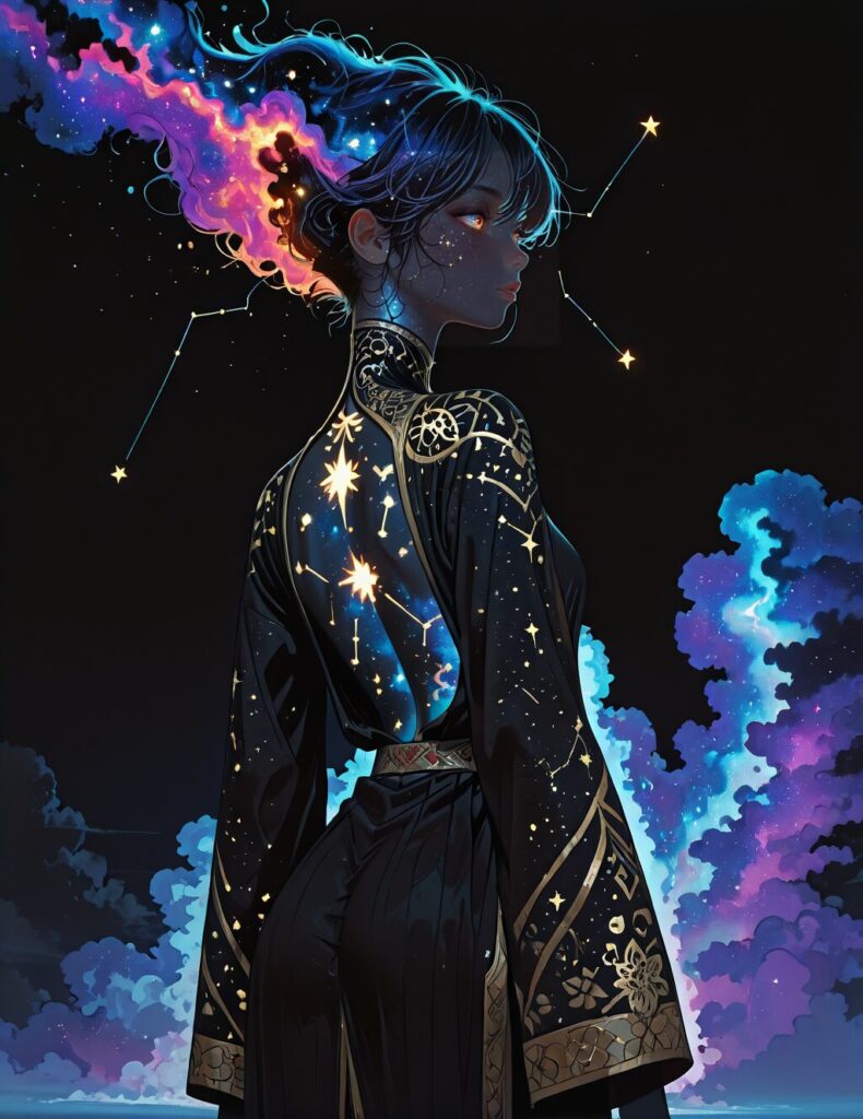 best quality, high res, 8k, Dark lighting, low lighting, night, dark background, nebula, 1girl,faceless,back view, intricate tattoo, constellation, glowing tattoo, open back robe, cosmic entity, looking back at viewer, burning eyes<lora:Mix_Style:1>