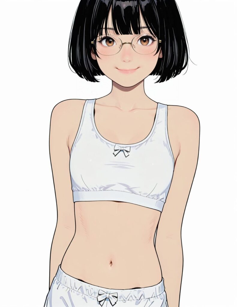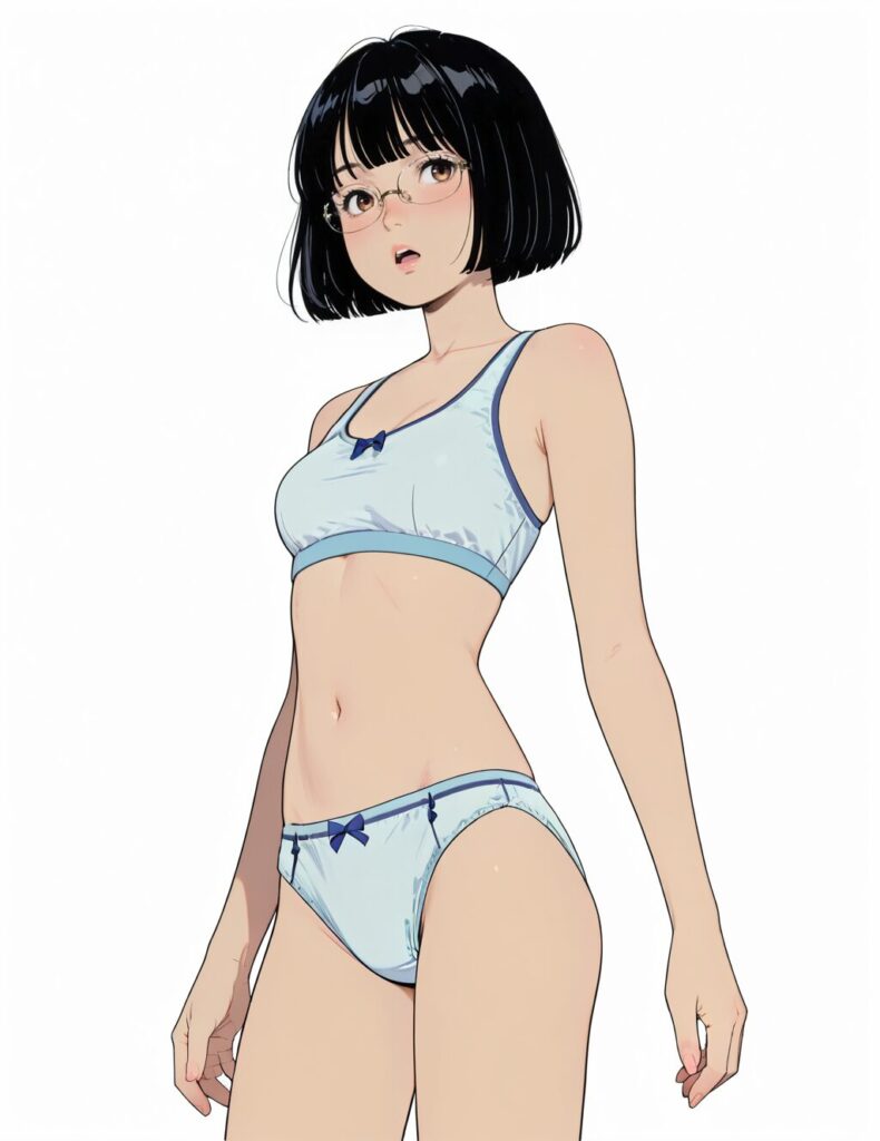 masterpiece,best quality,absurdres,official art,official style,source_anime,anime screencap,anime coloring,, bowspobra, blue bow on white sports bra, blue bow on white panties, 1girl,solo,bob cut,black hair, short hair, brown eyes,open mouth,white background,cowboy shot,glasses,rimless eyewear, <lora:bowspobra_IL:1>