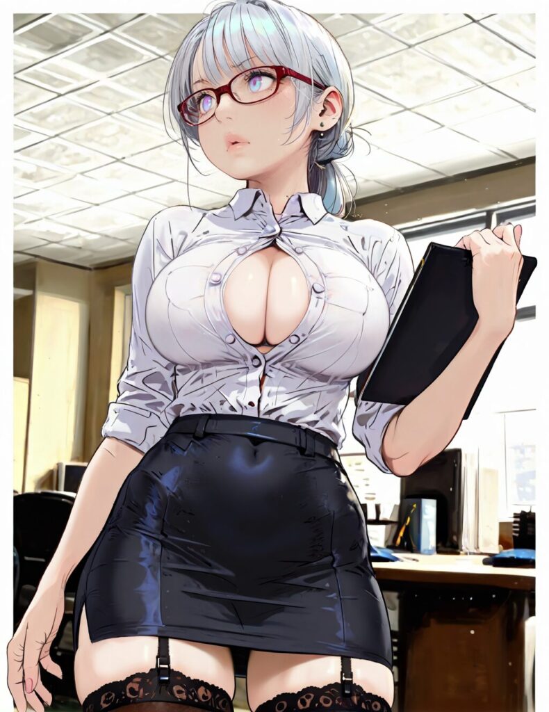 white borders,1girl, perfect skin,perfect eyes, breasts,((perfect face)), (masterpiece), high quality, high res, (pretty eyes), silver_hair, ((solo)), office, BREAK 1girl, glasses, office_lady, white_button shirt, pencil skirt, thighhighs, garter belt, holding folder, NO_LORA