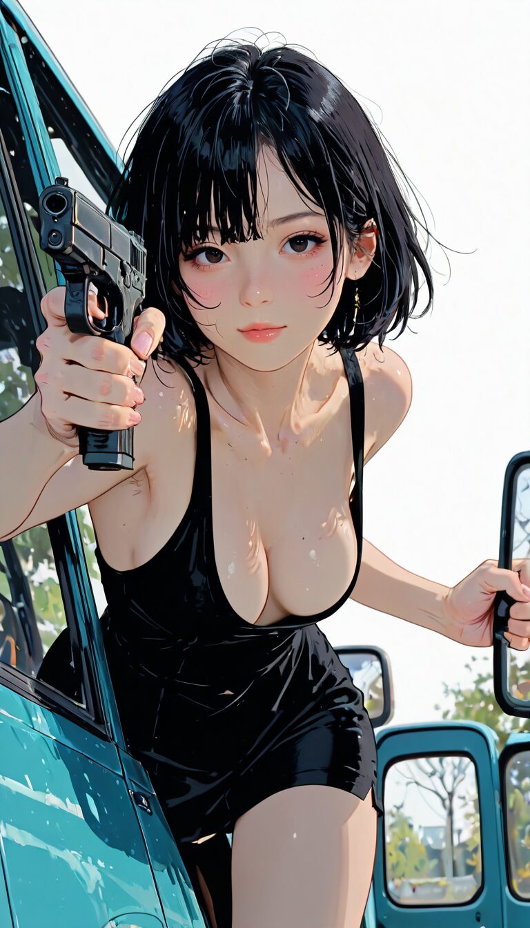 masterpiece,best quality,amazing quality,very aesthetic,high resolution,ultra detailed,perfect details, 1girl,black_hair,solo,,mai_fireincar,aiming_at_viewer,collarbone,downblouse,holding_gun,looking_at_viewer,car,from_outside, <lora:mai_fireincar:0.6>