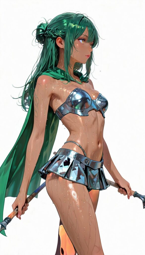Solo, cowboy shot, side view, side angle, amazing piece, masterpiece, 1girl, 21 years old, (1girl:(green long hair, dark skinned skin, golden eyes, long hair hairstyle )) BREAK girl standing stance, walking stance, walk, girl holding short spear( wooden stick and iron tip), armpits, simple background, white background BREAK (girl clothes :( heavy bikini_armor, metal bikini armor, iron bikini armor, sleeveless, strapless, navel, bare shoulders, bare arms, bare legs, ultraminiskirt, metal skirt, iron skirt, microskirt, ultraminiskirt, ultrmnskrt, green cape, short cape, heeled sandal )), small breasts, looking away, sweaty skin <lora:soldier_girls_thief_despite_herself:0.8>