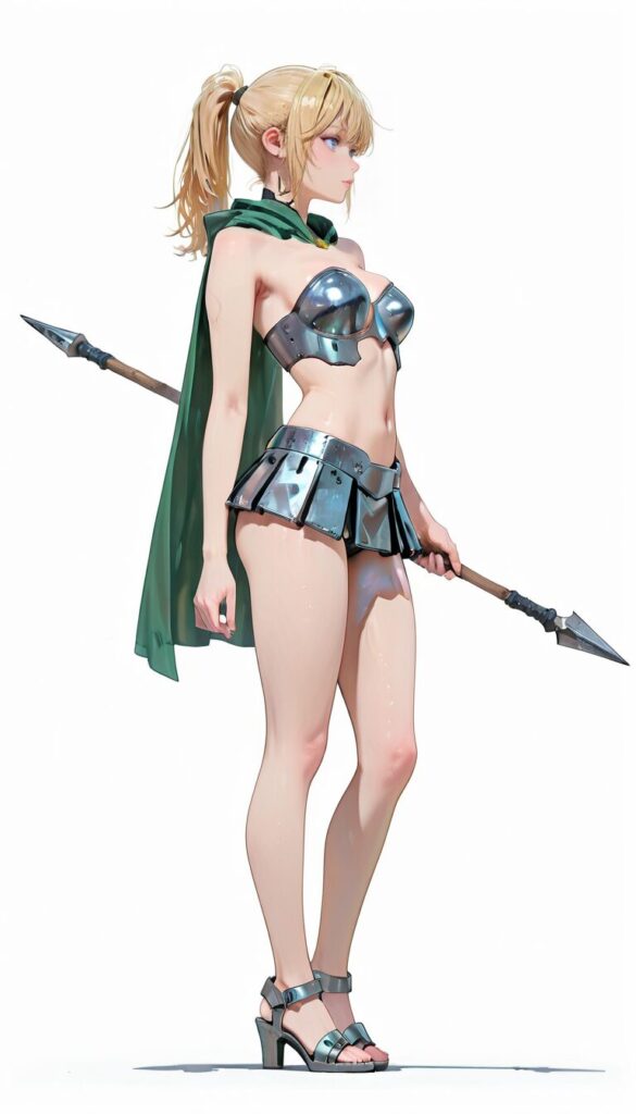 Solo, full body shot, side view, side angle, amazing piece, masterpiece, 1girl, 21 years old, (1girl:(blonde girl, blue eyes, ponytail )) BREAK girl standing stance, girl holding spear( wooden stick and iron tip), armpits, simple background, white background BREAK (girl clothes :( heavy bikini_armor, metal bikini armor, iron bikini armor, sleeveless, strapless, navel, bare shoulders, bare arms, bare legs, ultraminiskirt, metal skirt, iron skirt, microskirt, ultraminiskirt, ultrmnskrt, green cape, short cape, heeled sandal )), medium breasts, looking away<lora:soldier_girls_thief_despite_herself:0.8>