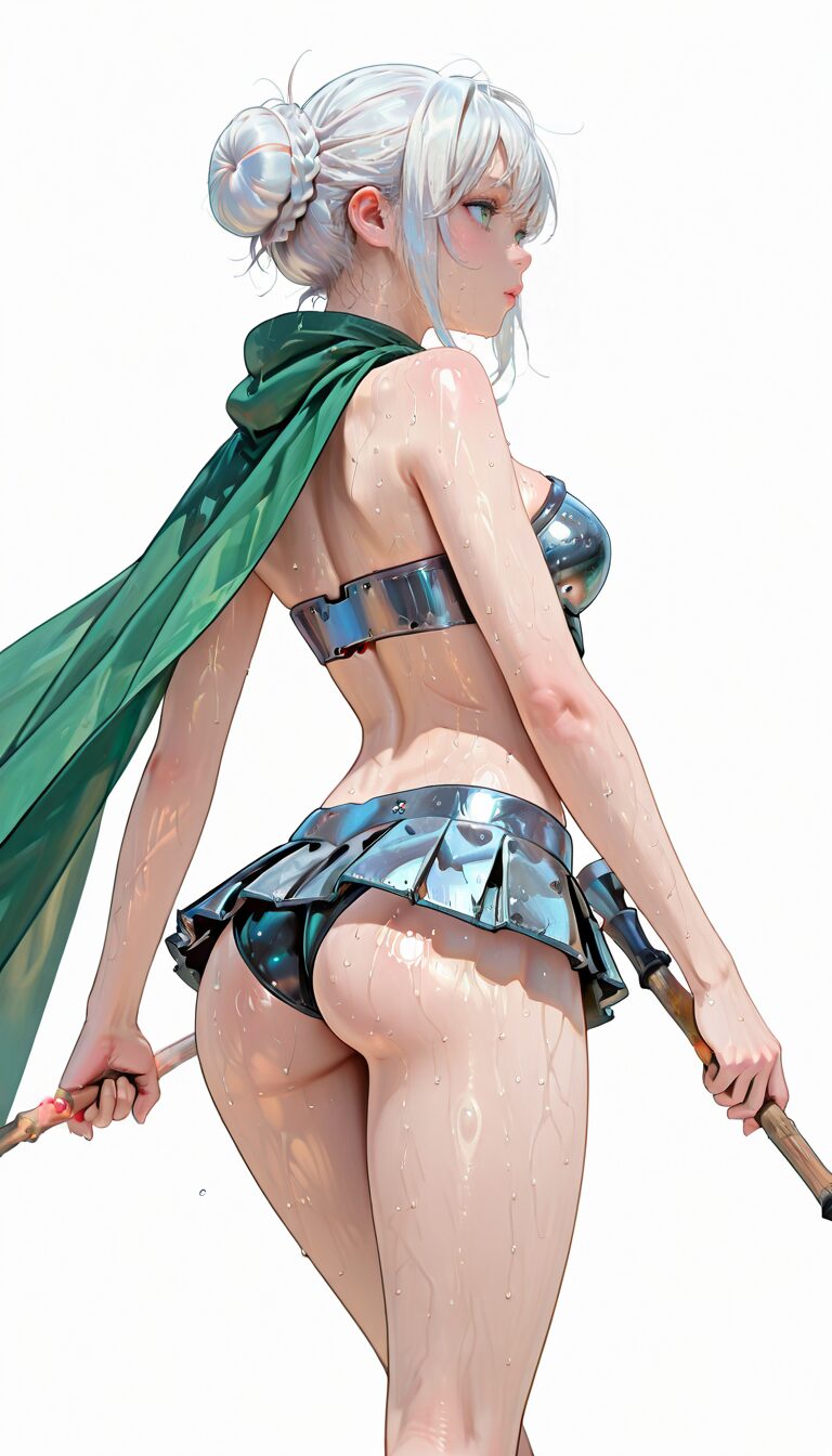 Solo, cowboy shot, rear view, back angle, ass, amazing piece, masterpiece, 1girl, 21 years old, (white hair, green eyes, one bun hairstyle, bang)) BREAK girl standing stance, walking stance, walk, girl holding short spear( wooden stick and iron tip), armpits, simple background, white background BREAK (girl clothes :( heavy bikini_armor, metal bikini armor, iron bikini armor, sleeveless, strapless, navel, bare shoulders, bare arms, bare legs, ultraminiskirt, metal skirt, iron skirt, microskirt, ultraminiskirt, ultrmnskrt, green cape, short cape )), medium breasts, looking away, sweaty skin <lora:soldier_girls_thief_despite_herself:0.8>