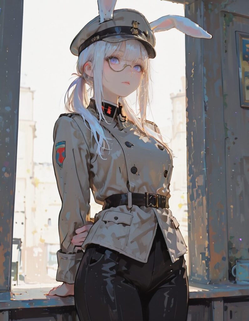 masterpiece, best quality, amazing quality, very aesthetic, absurdres, newest, 1girl, solo, white hair, split ponytail, long hair, purple eyes, monocle, gray military uniform, gray military hat, white bunny ears, animal ears, brown under shirtm military coat, perfect proportions, perfect anatomy, hands behind back, formal, fully body view, black pants, perfect proportions, perfect anatomy, <lora:Cinematic_Dream:0.8>