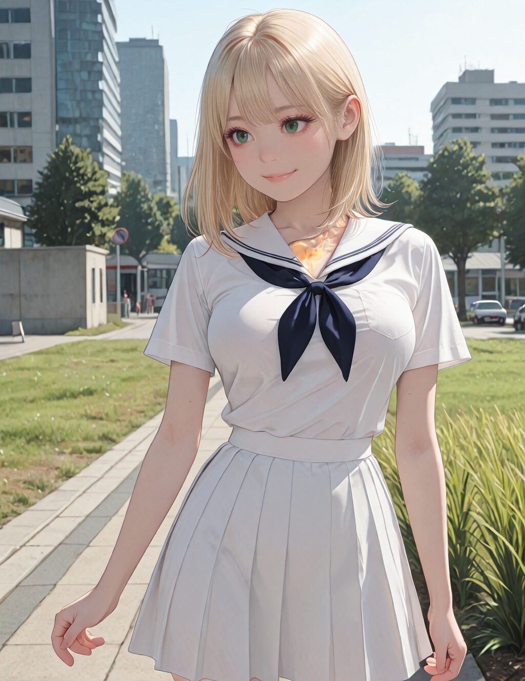 masterpiece, best quality, amazing quality, very aesthetic, absurdres, cute round face, slender, detailed eyes, detailed hair, kawaii, 1girl, solo, cowboy shot, shooting from front, smile, closed mouth, looking at viewer, medium hair, blonde hair, dark green eyes, white school uniform, medium breasts, school ground, school, yard, buildings, city, grass, extremely detailed background, photoreal background <lora:eyelashext_v10:-1>