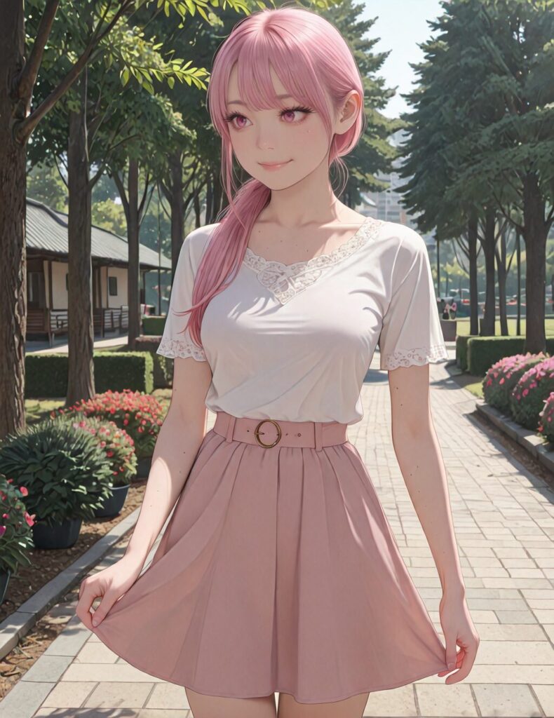 masterpiece, best quality, amazing quality, very aesthetic, absurdres, cute round face, slender, detailed eyes, detailed hair, kawaii, 1girl, solo, (mature:0.5), dynamic angle, tsurime, best shadow, an extremely delicate and beautiful, gleaming skin, cowboy shot, in forest, park, garden, cityscape, standing, model pose, smile, street fasion, casual fashion, harajuku fashion, wearing skirt, (pink hair, pink eyes:1.2)<lora:eyelashext_v10:-1>