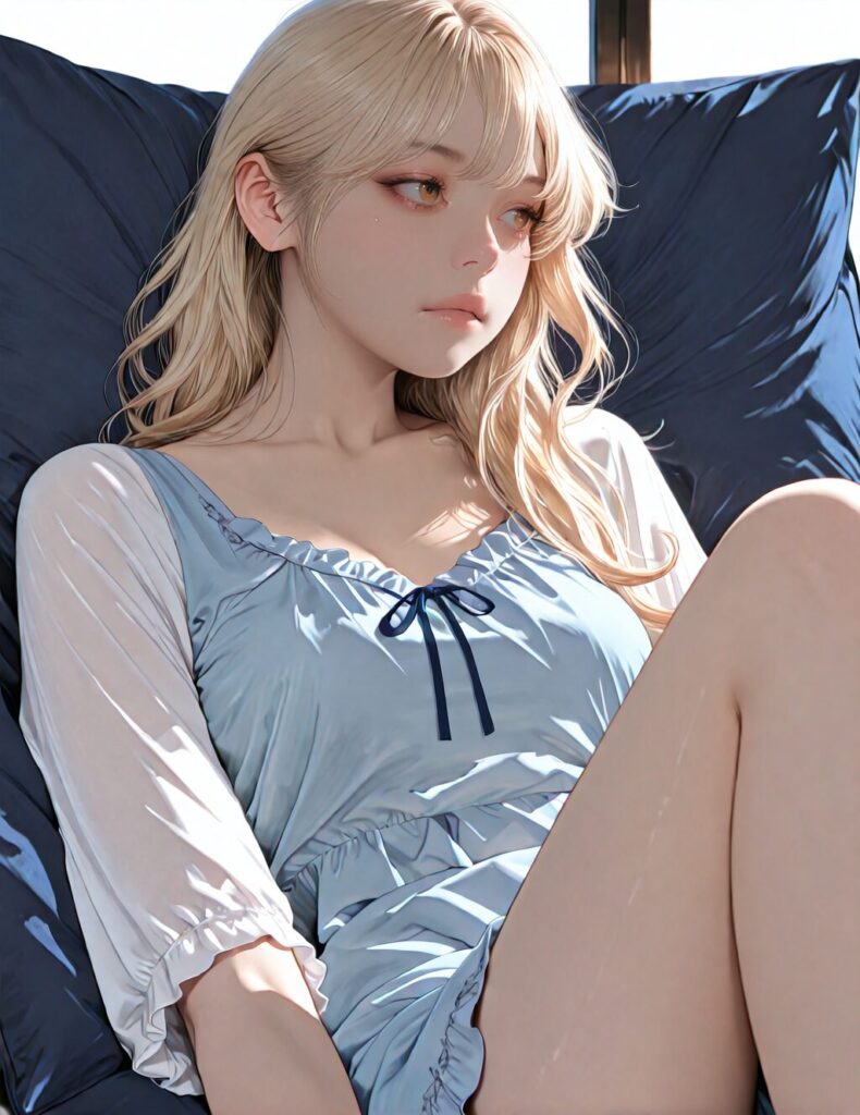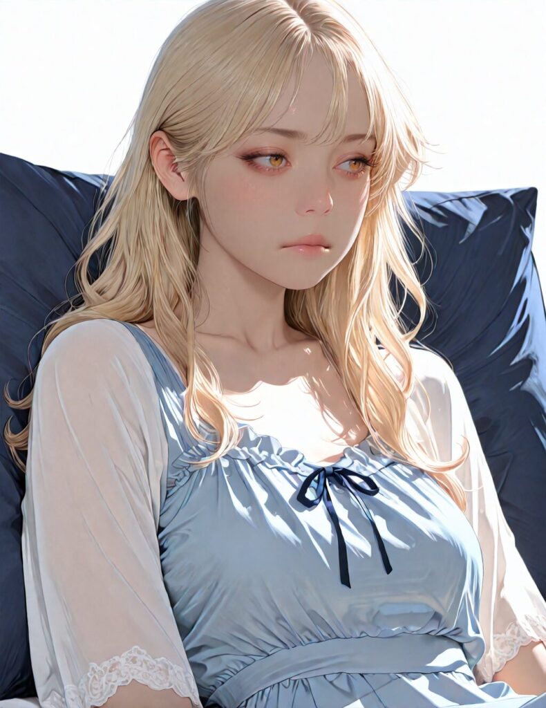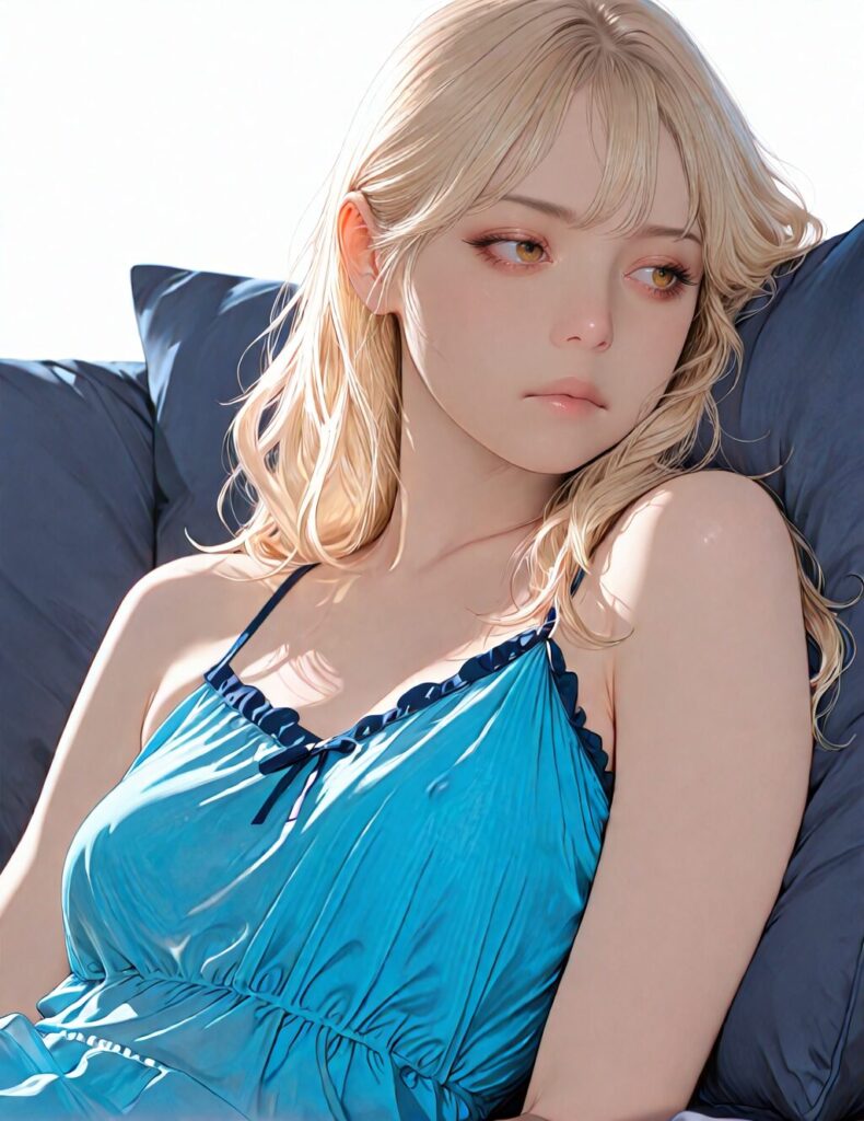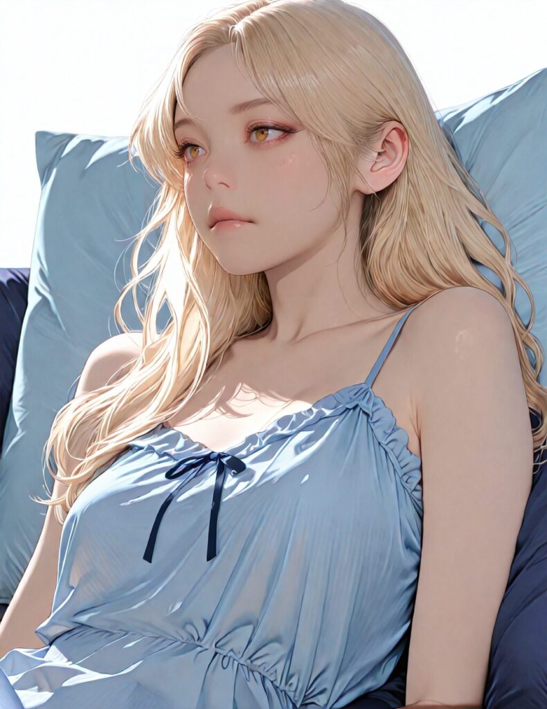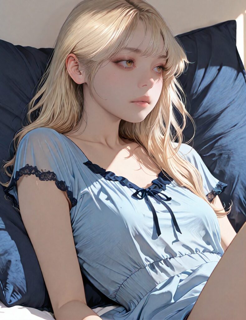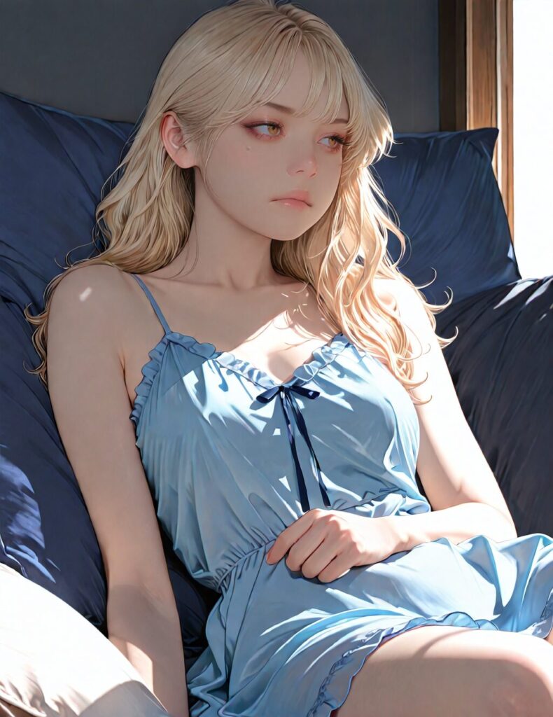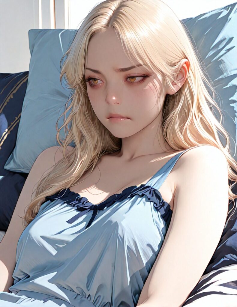 masterpiece, newest,absurdres,incredibly absurdres, best quality, amazing quality, very aesthetic, realistic, 1girl, blonde, blue nightgown, blue pillow, reclining, wavy hair, NO_LORA, disappointed