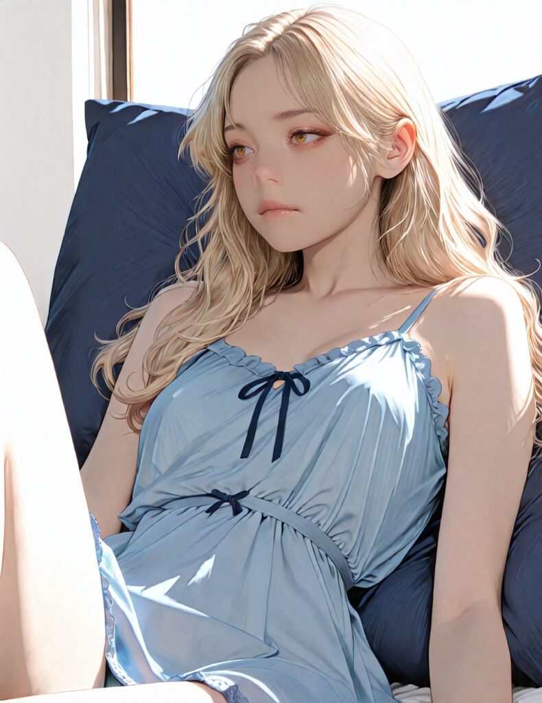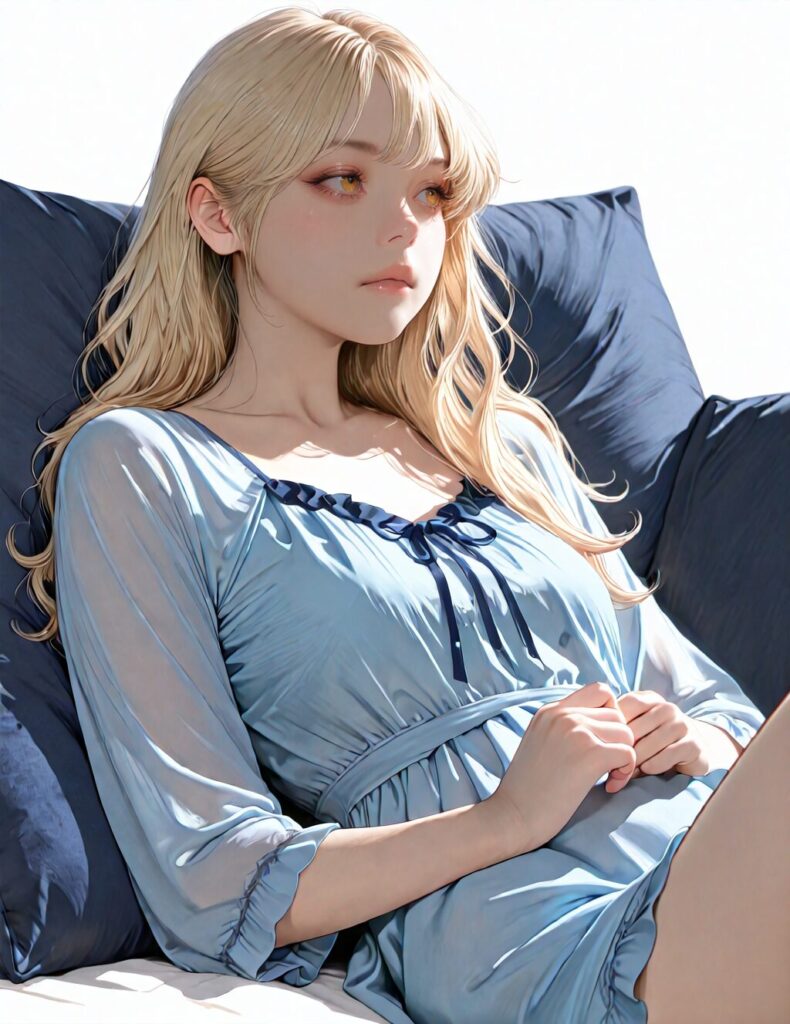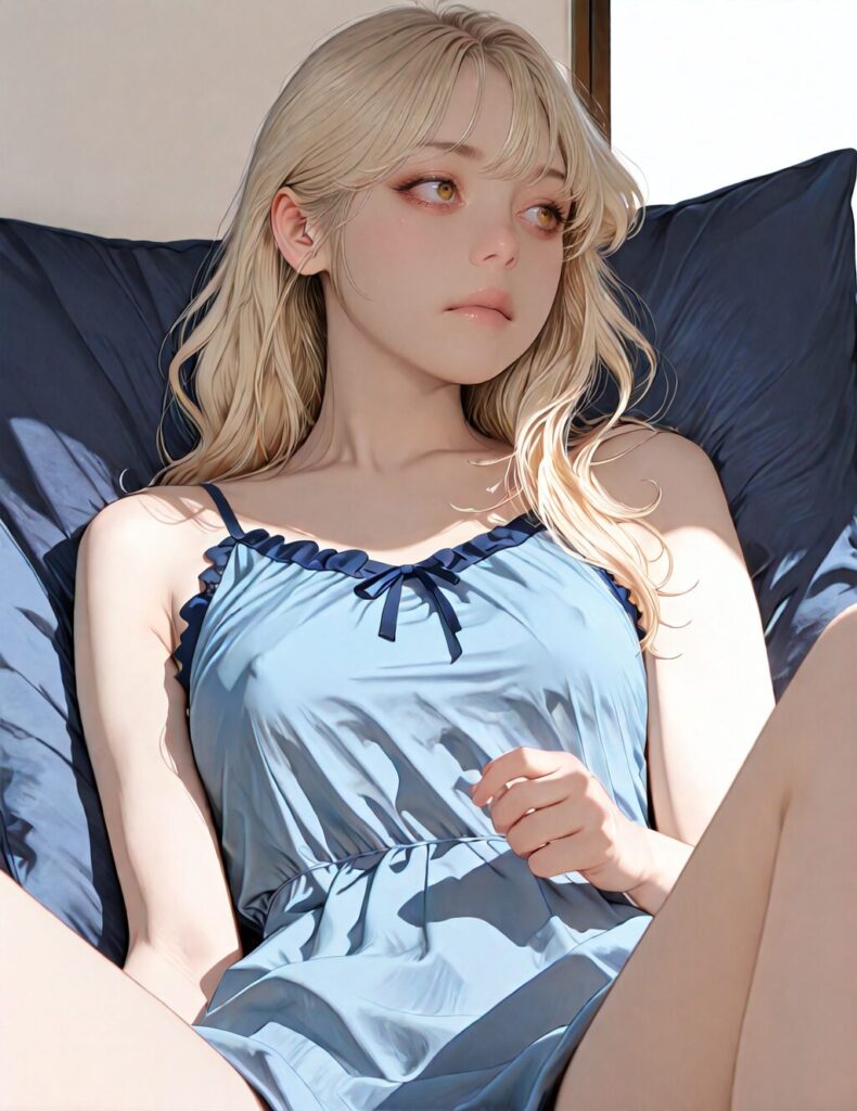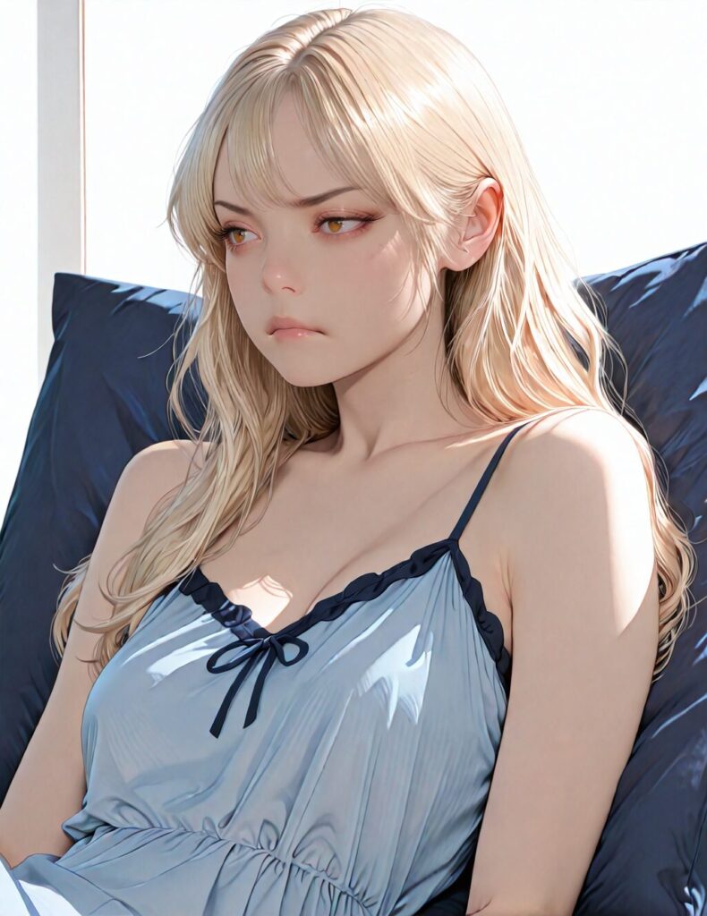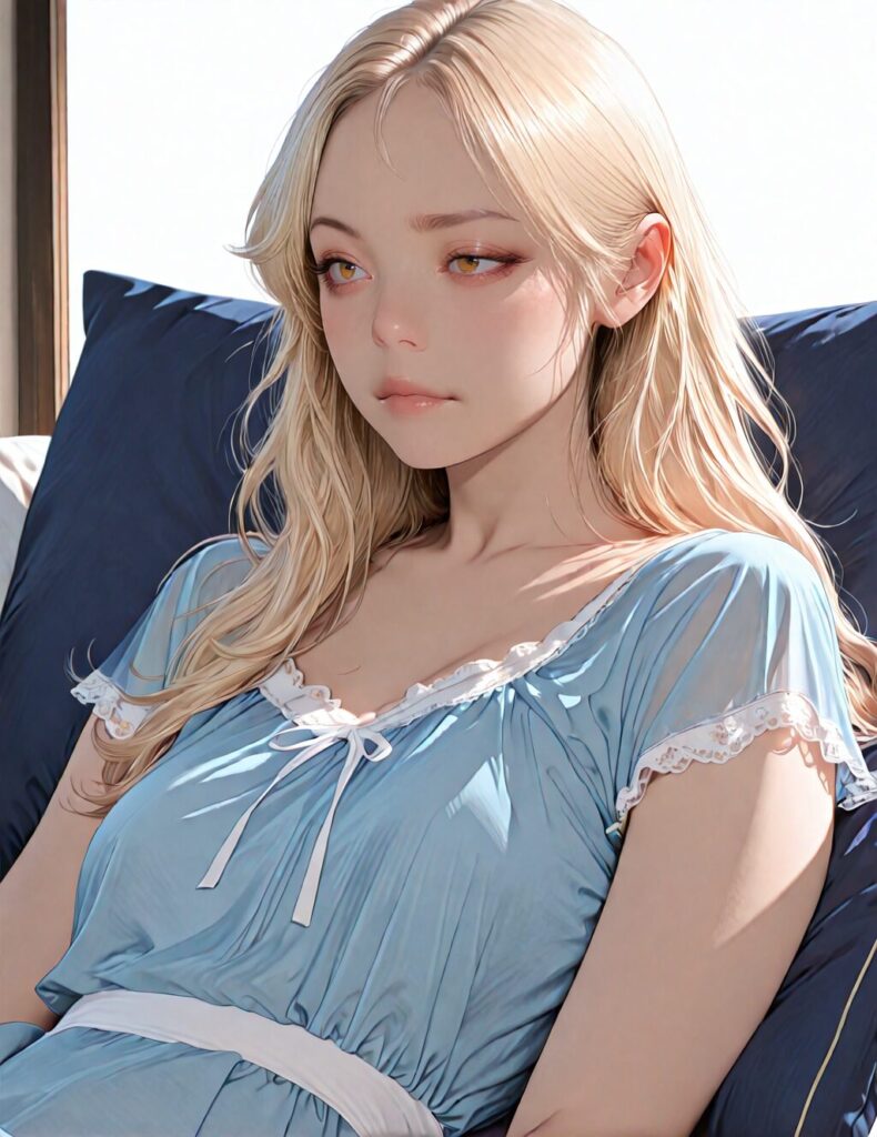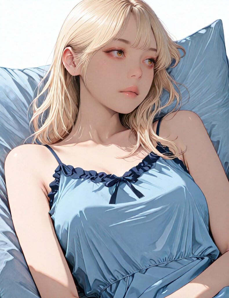 masterpiece, newest,absurdres,incredibly absurdres, best quality, amazing quality, very aesthetic, realistic, 1girl, blonde, blue nightgown, blue pillow, reclining, wavy hair, NO_LORA, disappointed