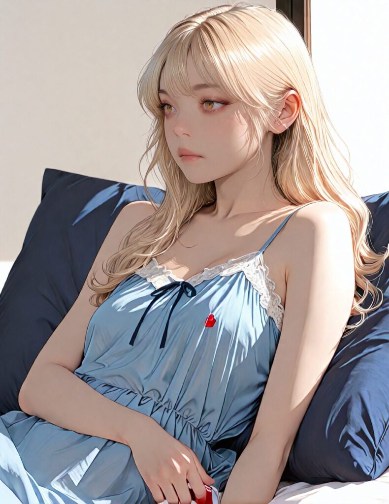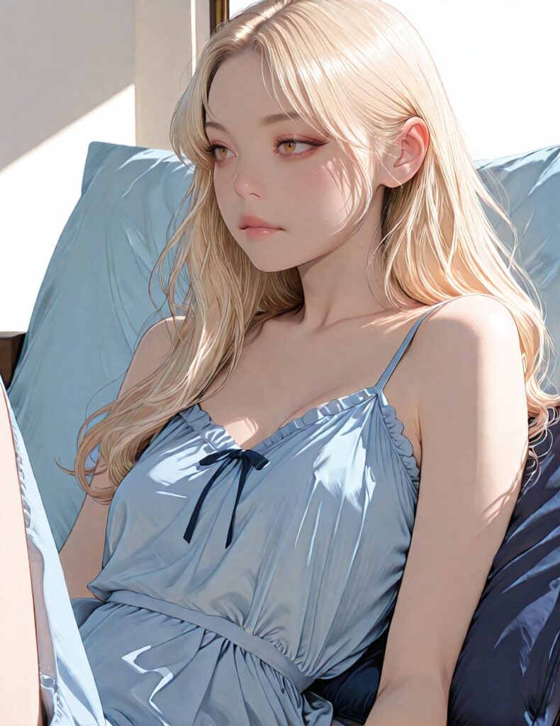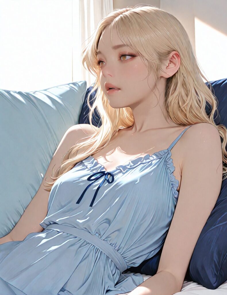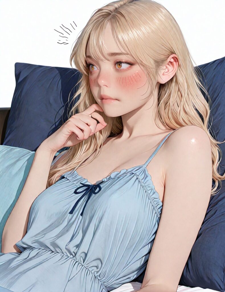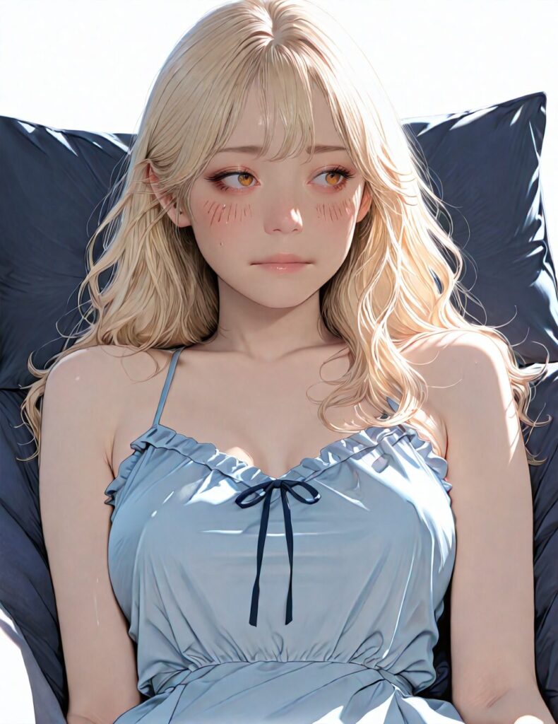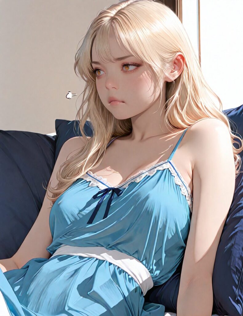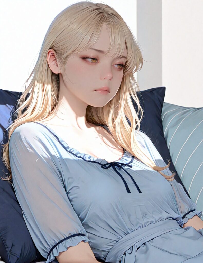 masterpiece, newest,absurdres,incredibly absurdres, best quality, amazing quality, very aesthetic, realistic, 1girl, blonde, blue nightgown, blue pillow, reclining, wavy hair, NO_LORA, disappointed