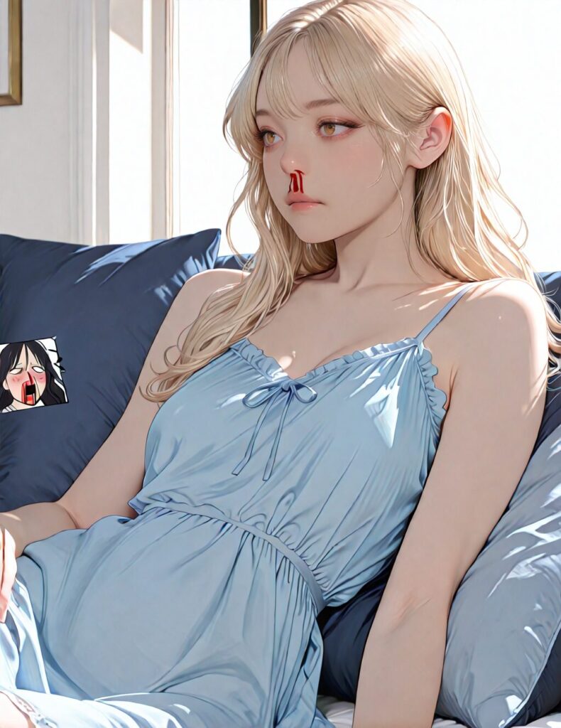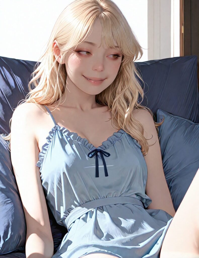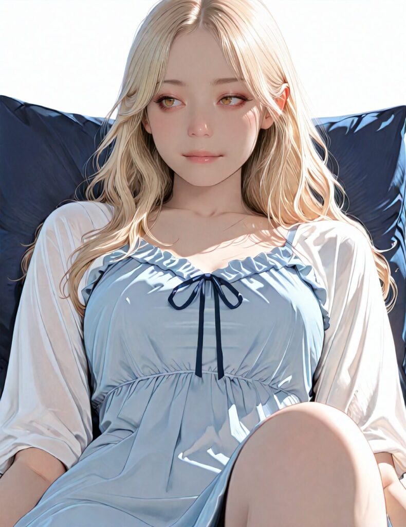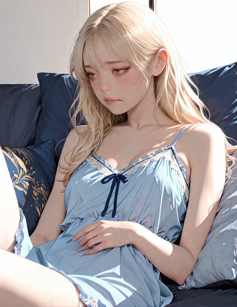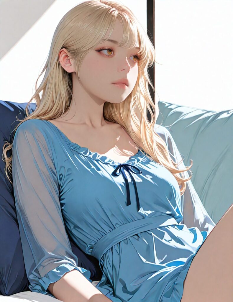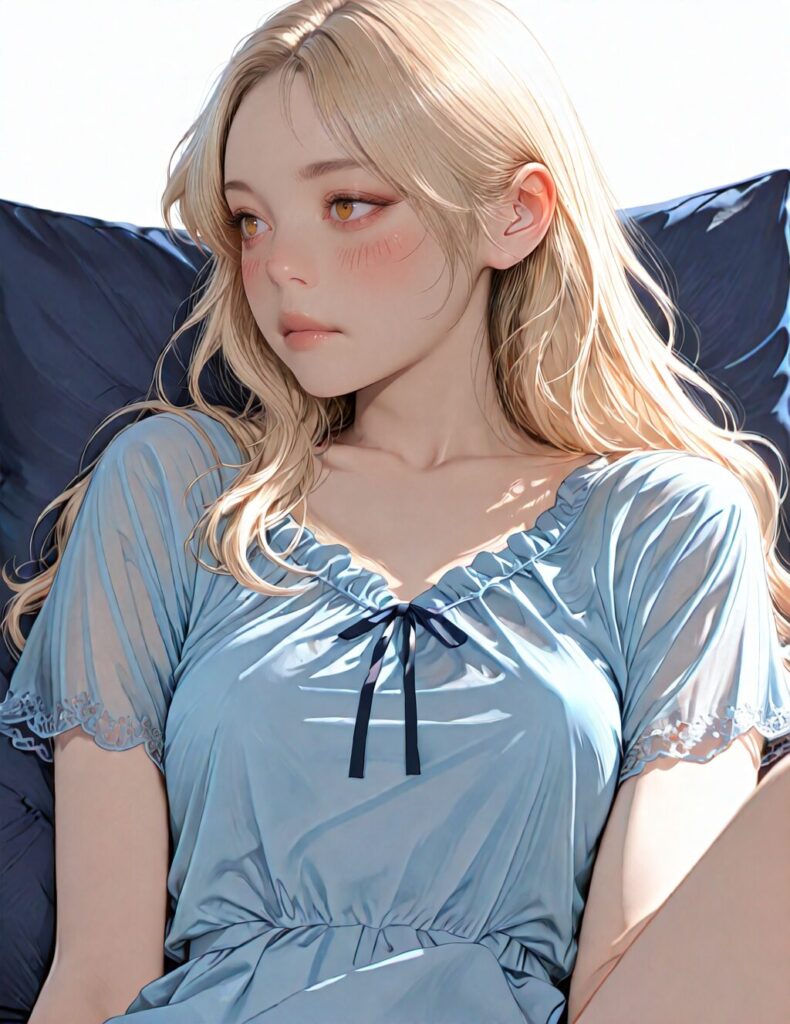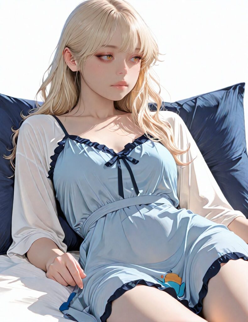 masterpiece, newest,absurdres,incredibly absurdres, best quality, amazing quality, very aesthetic, realistic, 1girl, blonde, blue nightgown, blue pillow, reclining, wavy hair, NO_LORA, disappointed