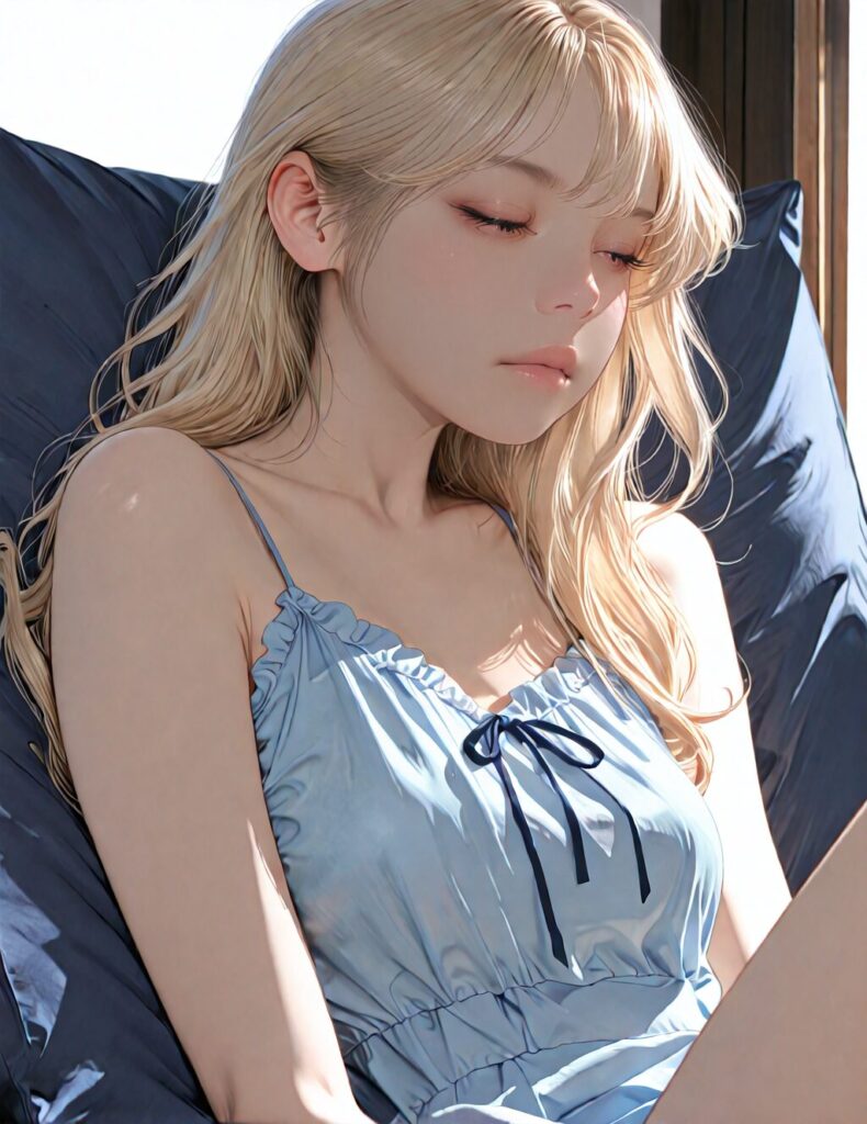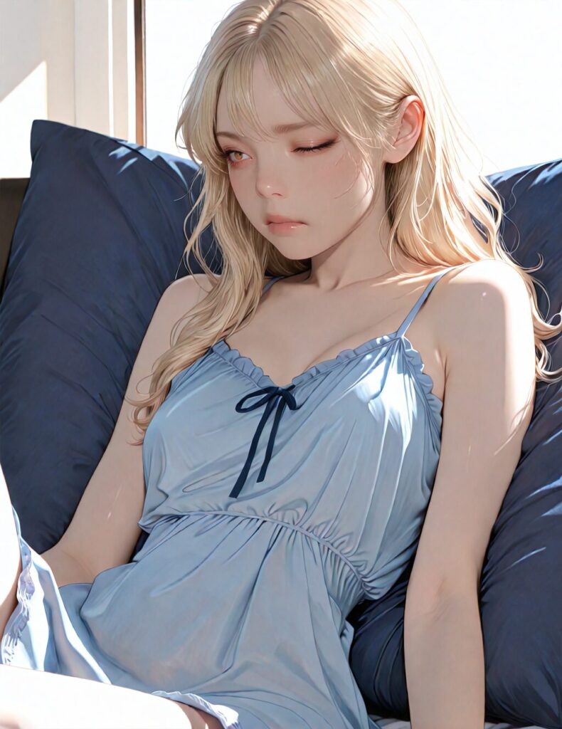 masterpiece, newest,absurdres,incredibly absurdres, best quality, amazing quality, very aesthetic, realistic, 1girl, blonde, blue nightgown, blue pillow, reclining, wavy hair, NO_LORA, closed eyes