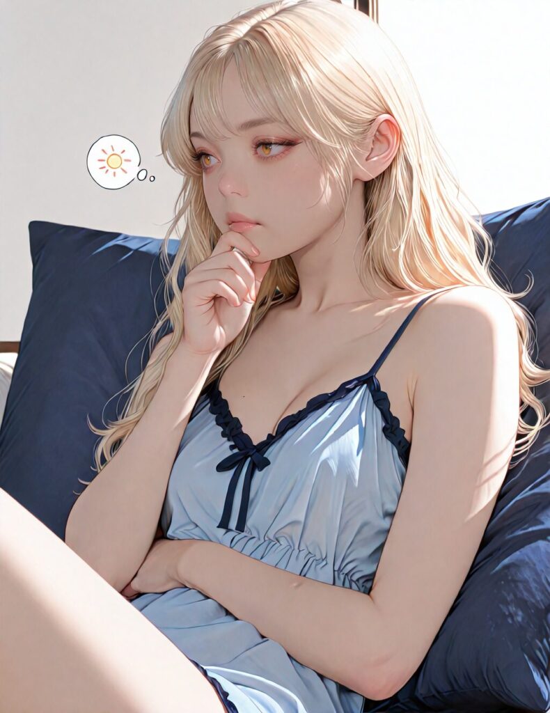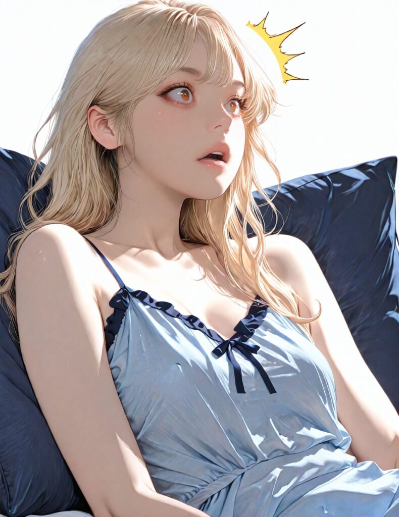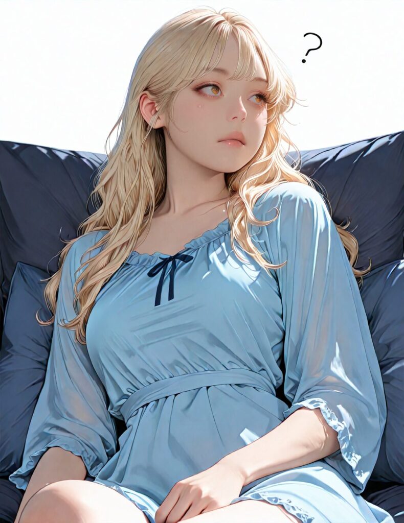 masterpiece, newest,absurdres,incredibly absurdres, best quality, amazing quality, very aesthetic, realistic, 1girl, blonde, blue nightgown, blue pillow, reclining, wavy hair, NO_LORA, confused
