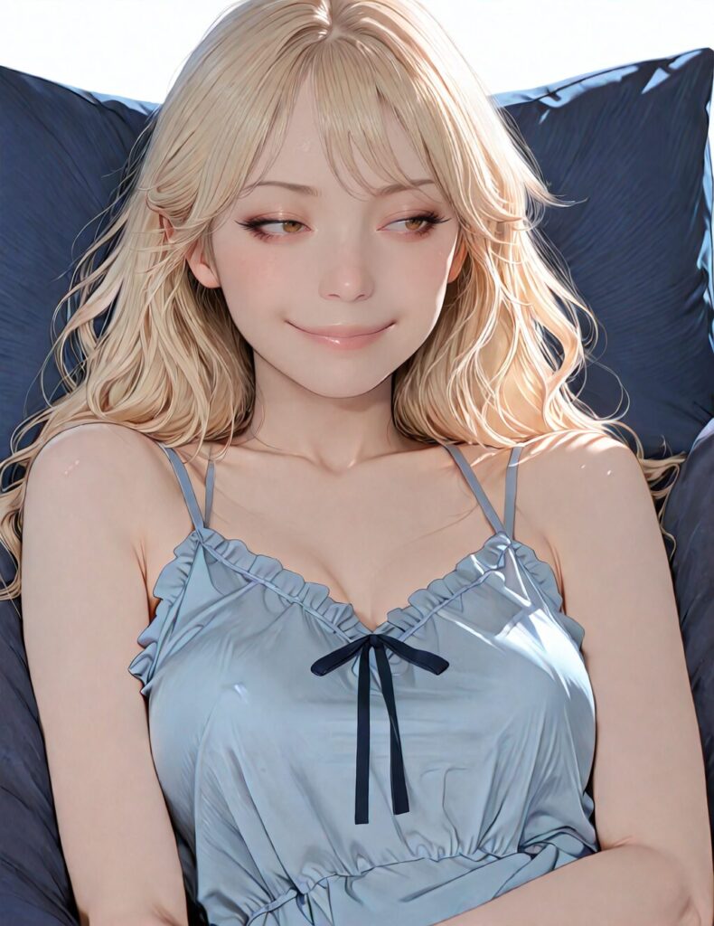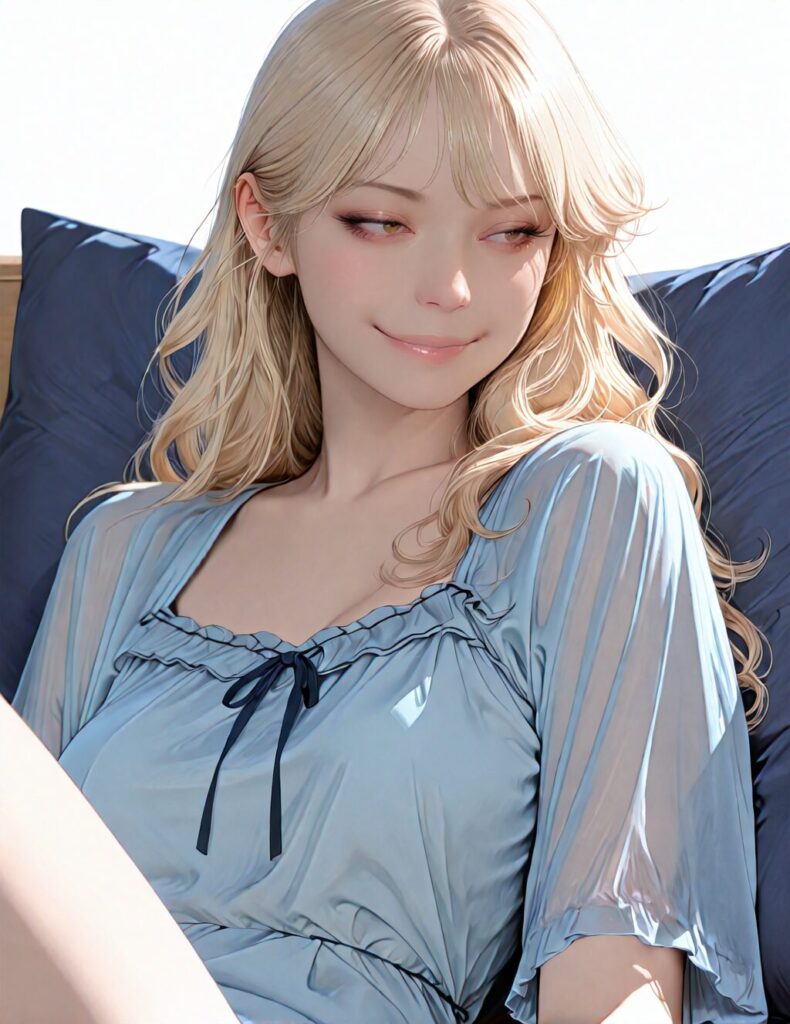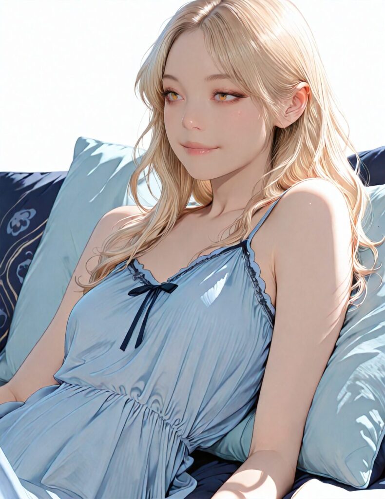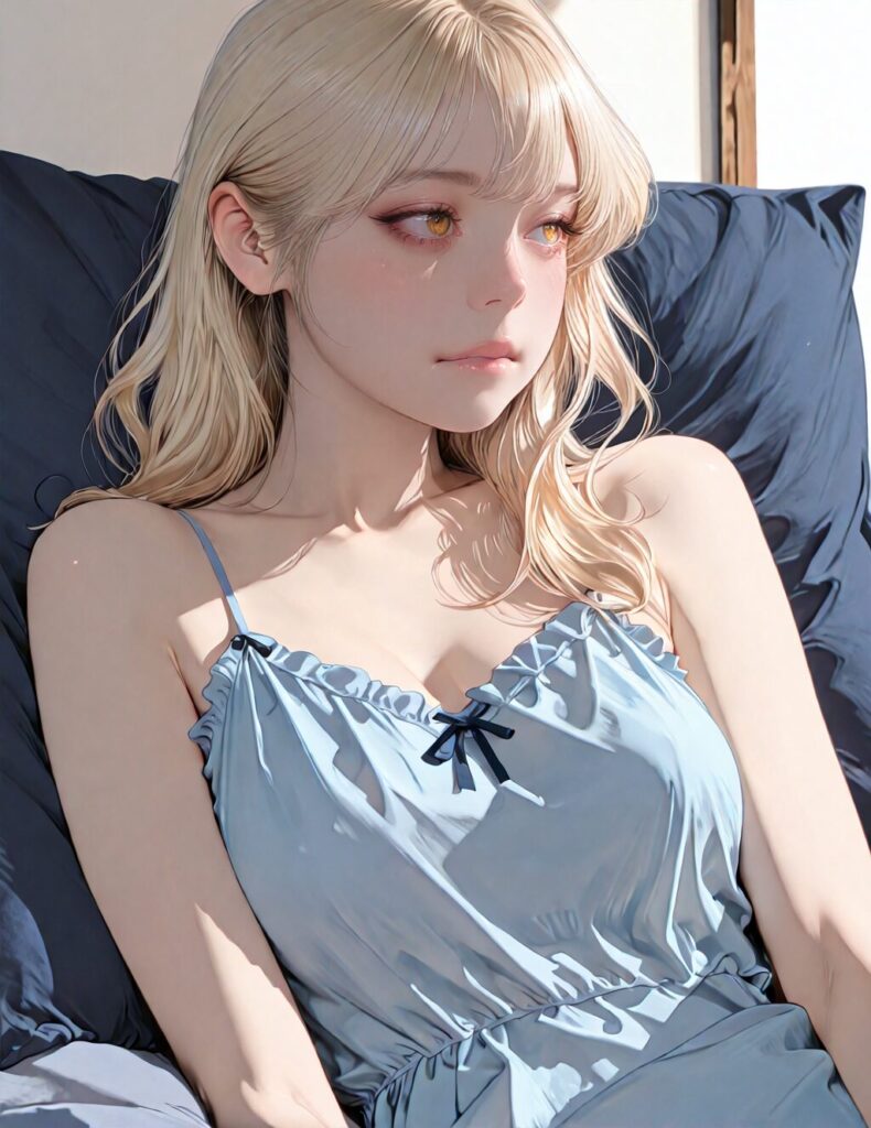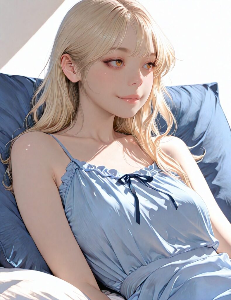 masterpiece, newest,absurdres,incredibly absurdres, best quality, amazing quality, very aesthetic, realistic, 1girl, blonde, blue nightgown, blue pillow, reclining, wavy hair, NO_LORA, afterglow,