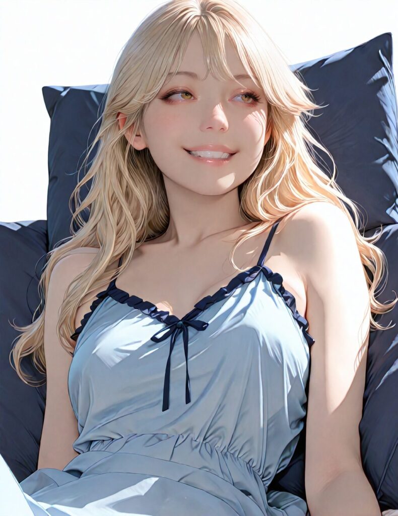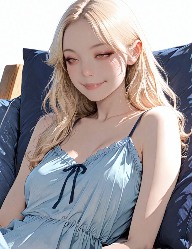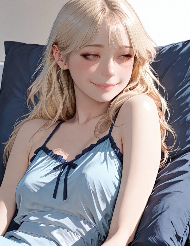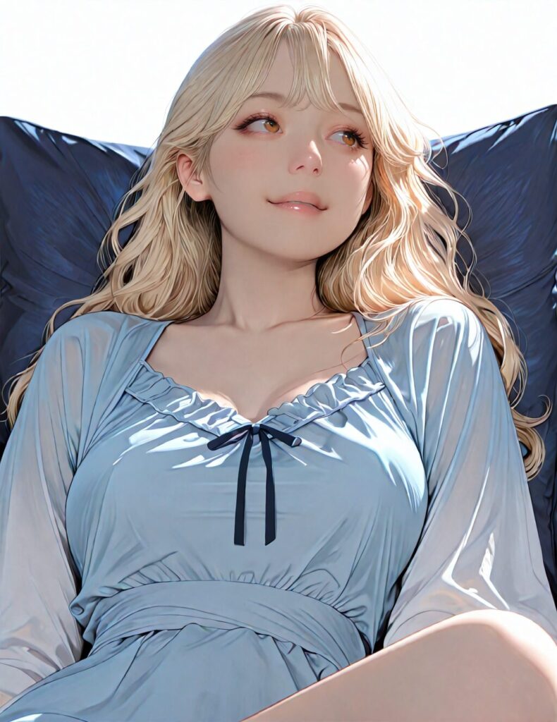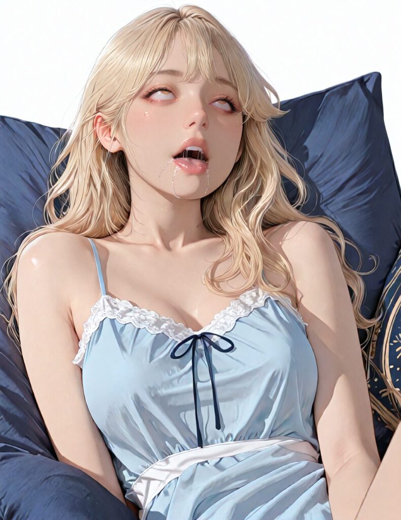 masterpiece, newest,absurdres,incredibly absurdres, best quality, amazing quality, very aesthetic, realistic, 1girl, blonde, blue nightgown, blue pillow, reclining, wavy hair, NO_LORA, afterglow,