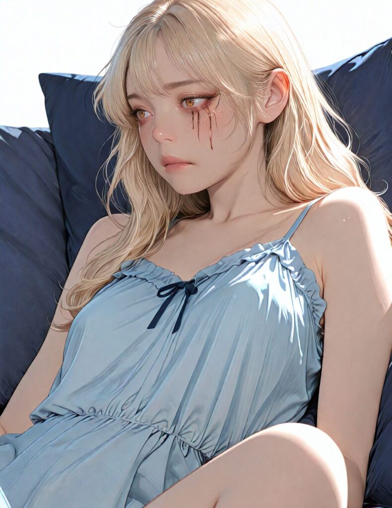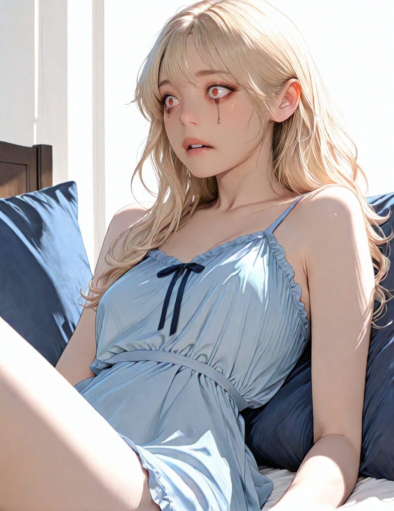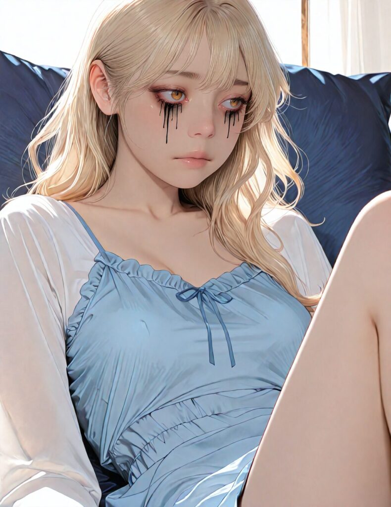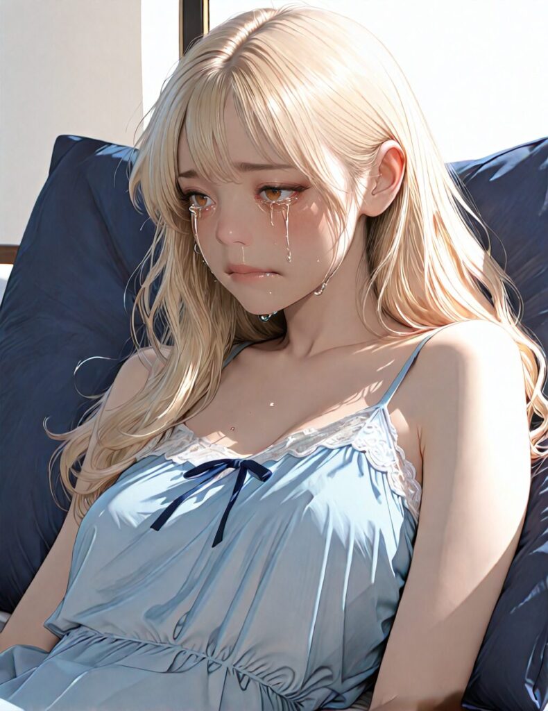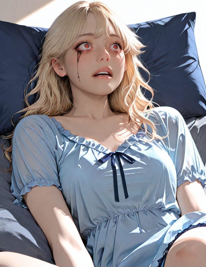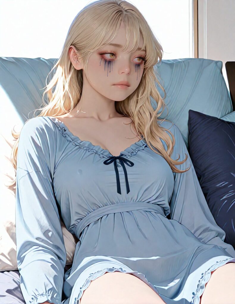 masterpiece, newest,absurdres,incredibly absurdres, best quality, amazing quality, very aesthetic, realistic, 1girl, blonde, blue nightgown, blue pillow, reclining, wavy hair, NO_LORA, despair