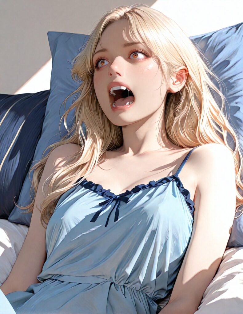 masterpiece, newest,absurdres,incredibly absurdres, best quality, amazing quality, very aesthetic, realistic, 1girl, blonde, blue nightgown, blue pillow, reclining, wavy hair, NO_LORA, determined