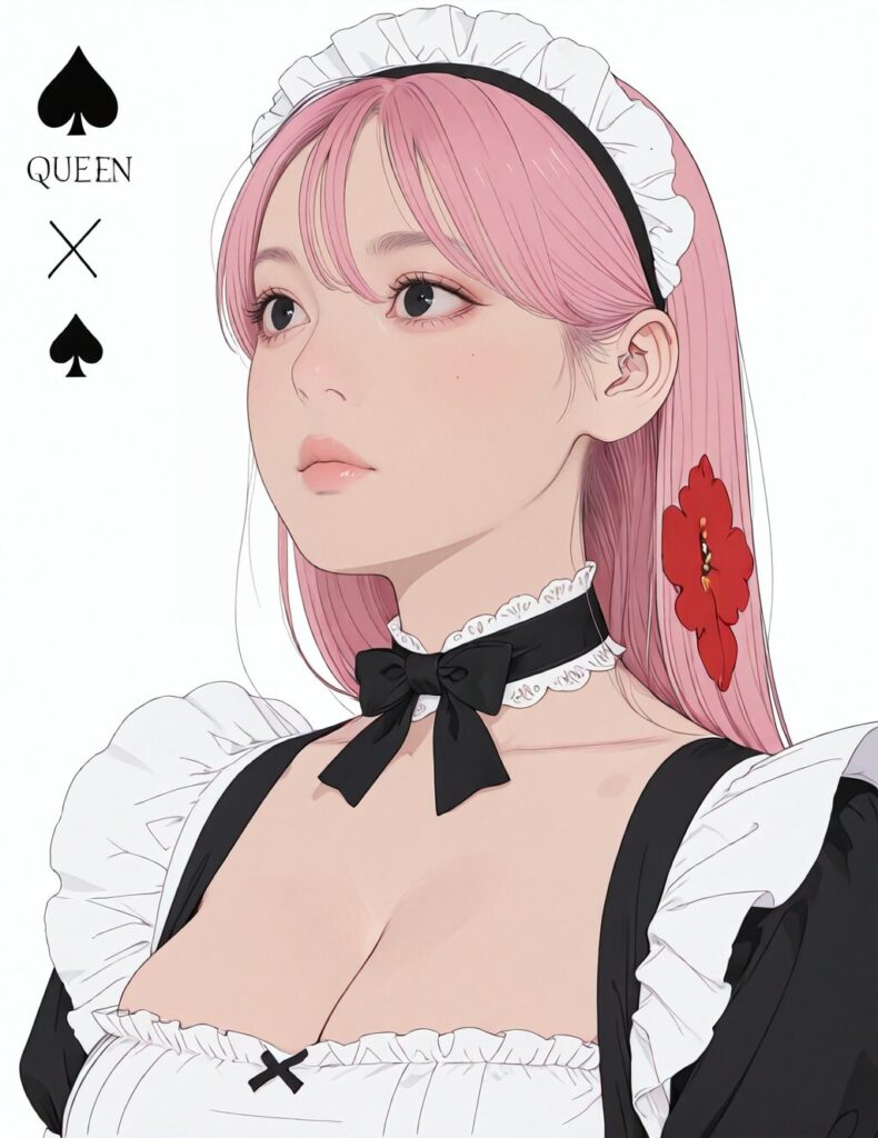1girl, civchan, pink hair, hair between eyes, maid costume, large breast, pcard_face, pqueen_face, line art, flat coloring, black eyes, (pcard_eyes, pcard_nose, pcard_lips:1.2), white_skin, highres, masterpiece, best quality, amazing quality, very awa, very aesthetic, <lora:playing _card_face_v2:0.7>