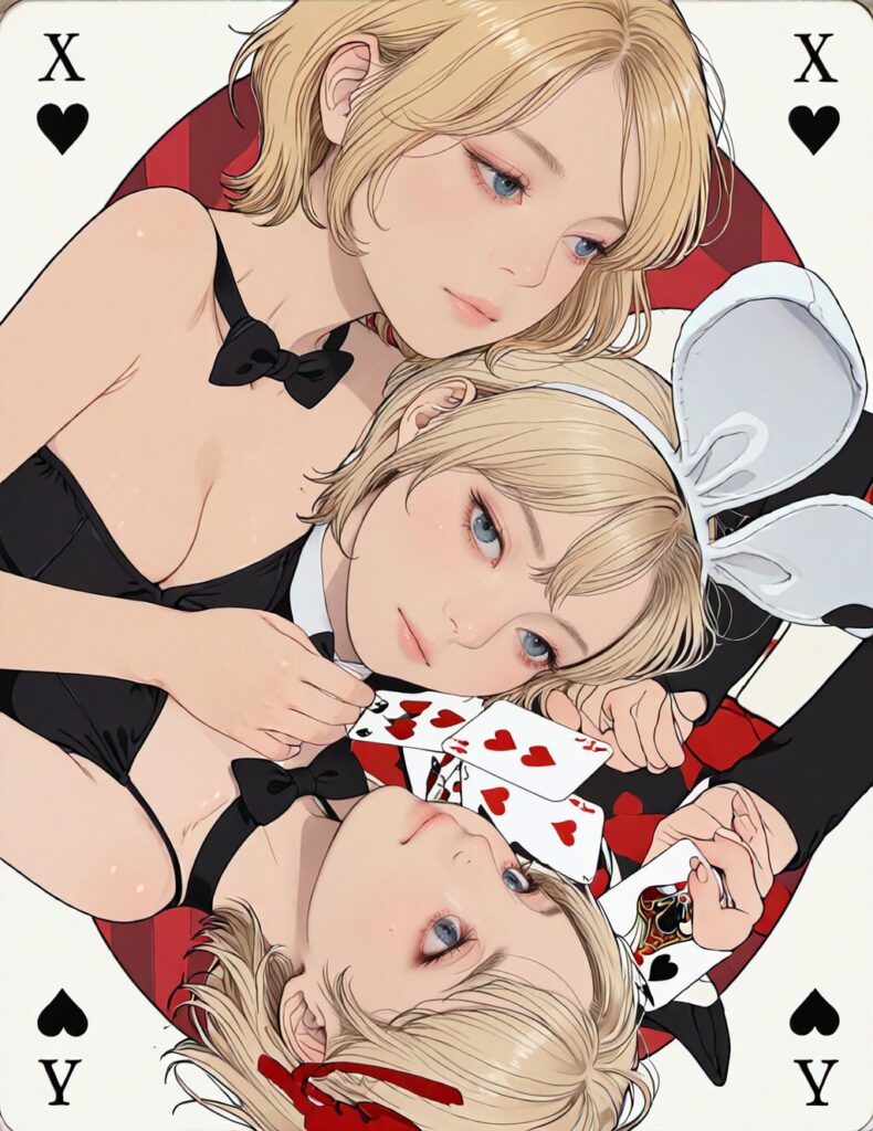 masterpiece, best quality, amazing quality, absurdres, best quality, c4rd, card (medium), playing card, ((rotational symmetry)), heart, queen of hearts (playing_card), line art, flat coloring, black eyes, pcard_eyes, pcard_nose, pcard_lips, white_skin, aigis. blonde hair, blue eyes, short blonde hair, short hair, bunny suits <lora:playing _card_face_v2:0.7>