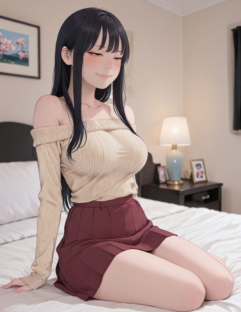 masterpiece, best quality, amazing quality, very aesthetic, absurdres, cute round face, slender, detailed eyes, detailed hair, kawaii, 1girl, solo, small, smile, brown eyes, semi long hair, black hair, very long sidelocks, medium large breasts, looking at viewer, beige sweater, off shoulder sweater, dark red skirt, full body, photo background, blurry background, girl bedroom, thighs, knees, sitting on bed <lora:sensualface1_xl_v30:1.1>