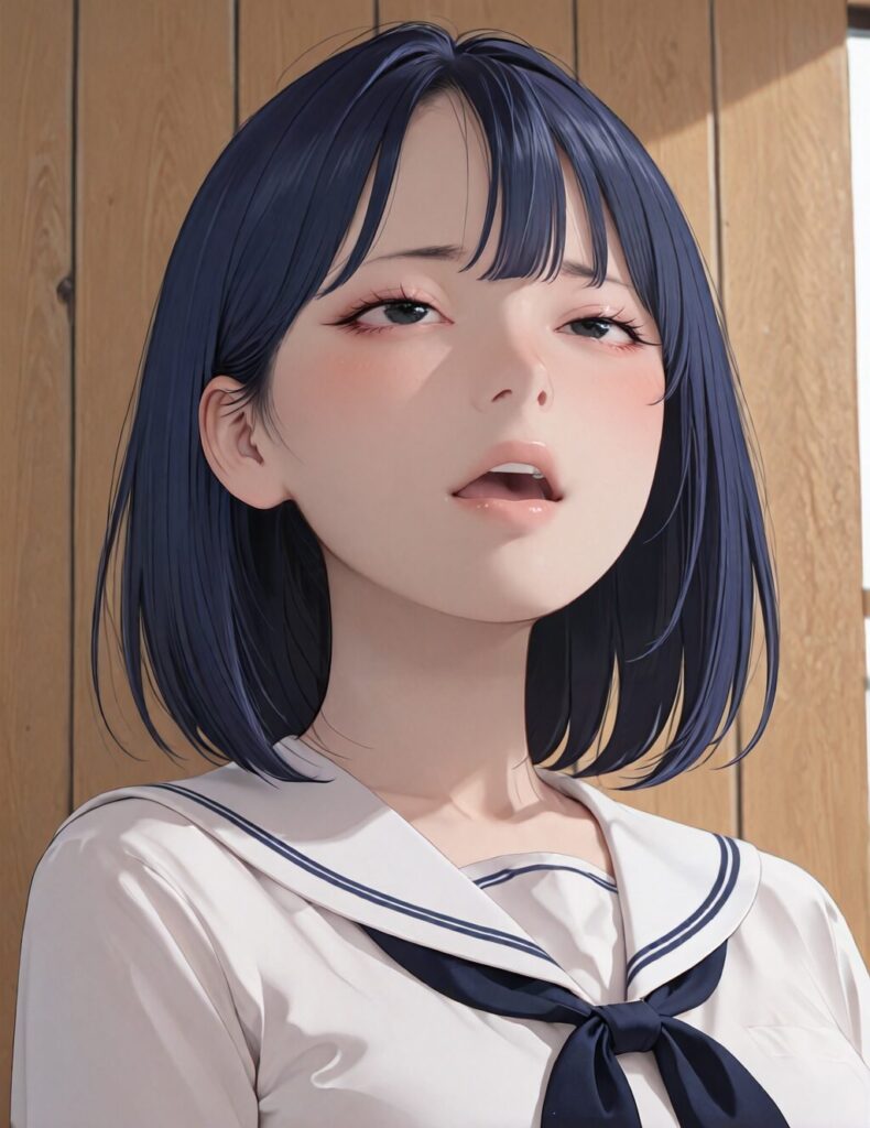 masterpiece, best quality, amazing quality, very aesthetic, absurdres, cute round face, slender, ultra detailed eyes, ultra detailed hair, ultra beautiful, 1girl, solo, 1girl, solo, shooting from front, white school uniform, open mouth, gasping, ecstasy, female orgasm, looking at viewer, wooden wall background, medium hair, dark_blue hair, black eyes<lora:sensualface1_xl_v30:0.8>