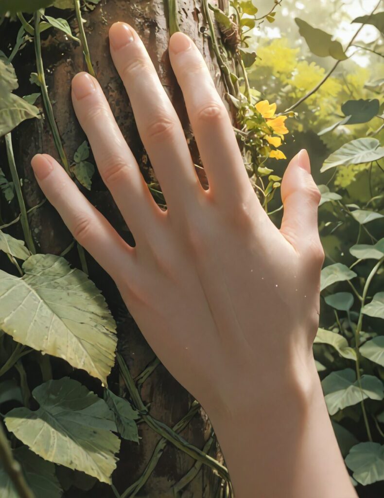 ,betterhand,Hand - focus, masterpiece, best quality, artistic composition, shadowy hand intertwined with tangled vines, overgrown wilderness backdrop, sense of nature reclaiming, striking visuals, powerful <lora:Betterhand1llust:0.7>