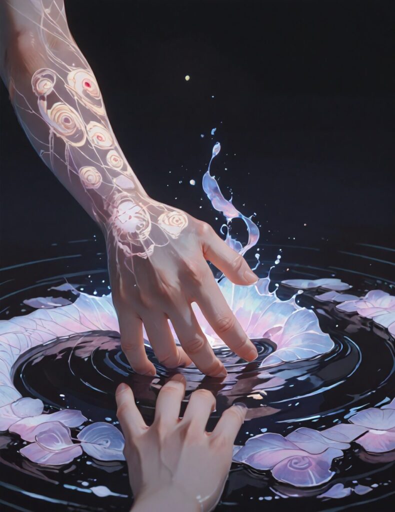 betterhand,Hand - focus, masterpiece, best quality, artistic composition, ghostly hand emerging from the water, ripples creating a mesmerizing pattern, ethereal reflections, magnetic tension, hauntingly serene.<lora:Betterhand1llust:0.7>