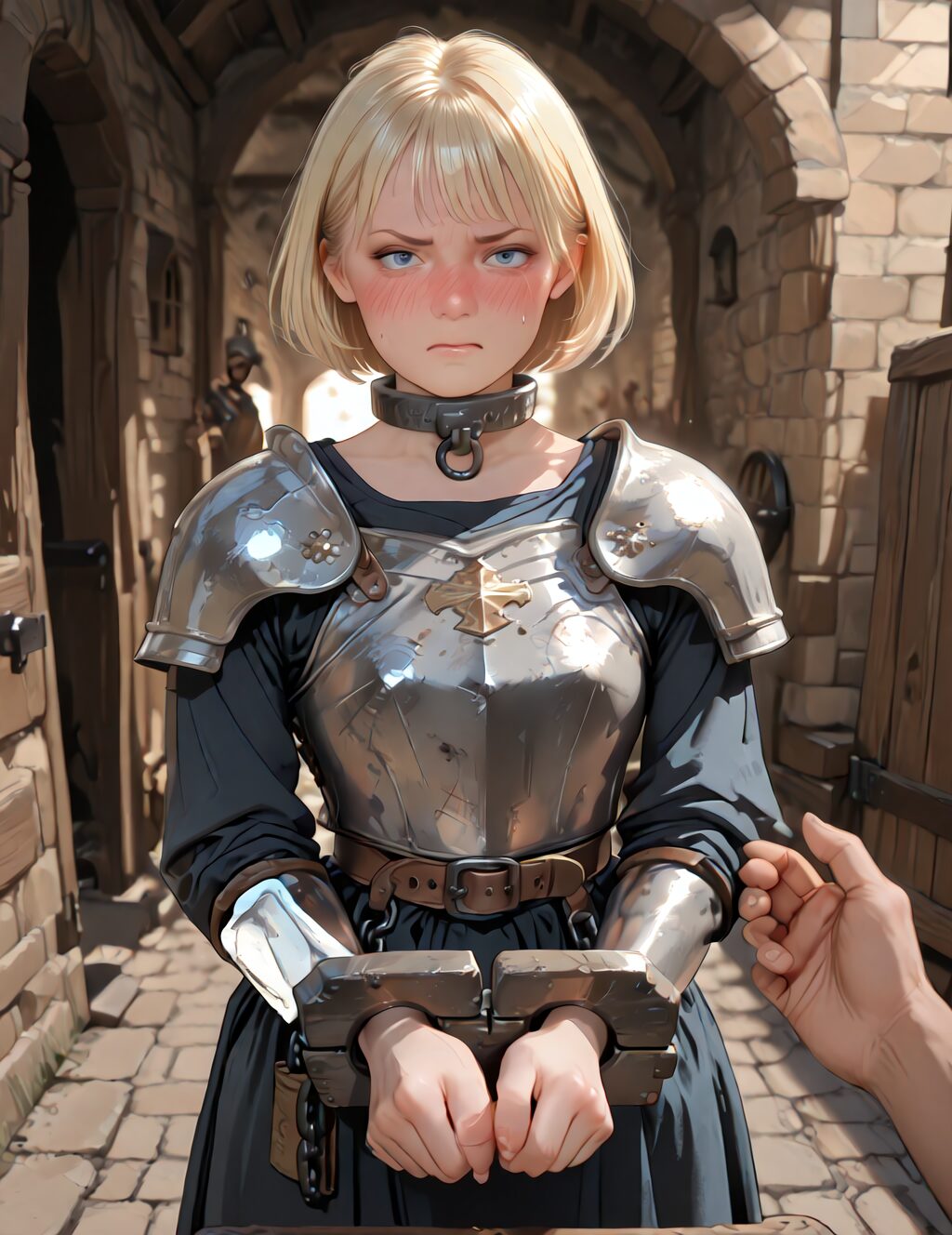 1girl, solo, solo focus, blonde hair, short hair, female knight, mail armor, wooden handcuffs, restraints, metal collar, chained collar, angry, disdain, disgust, embarrassed, full-face blush, tearful, face focus, cowboy shot, medieval european streetscape, POV hand holding chain <lora:Wooden_Handcuffs:1>