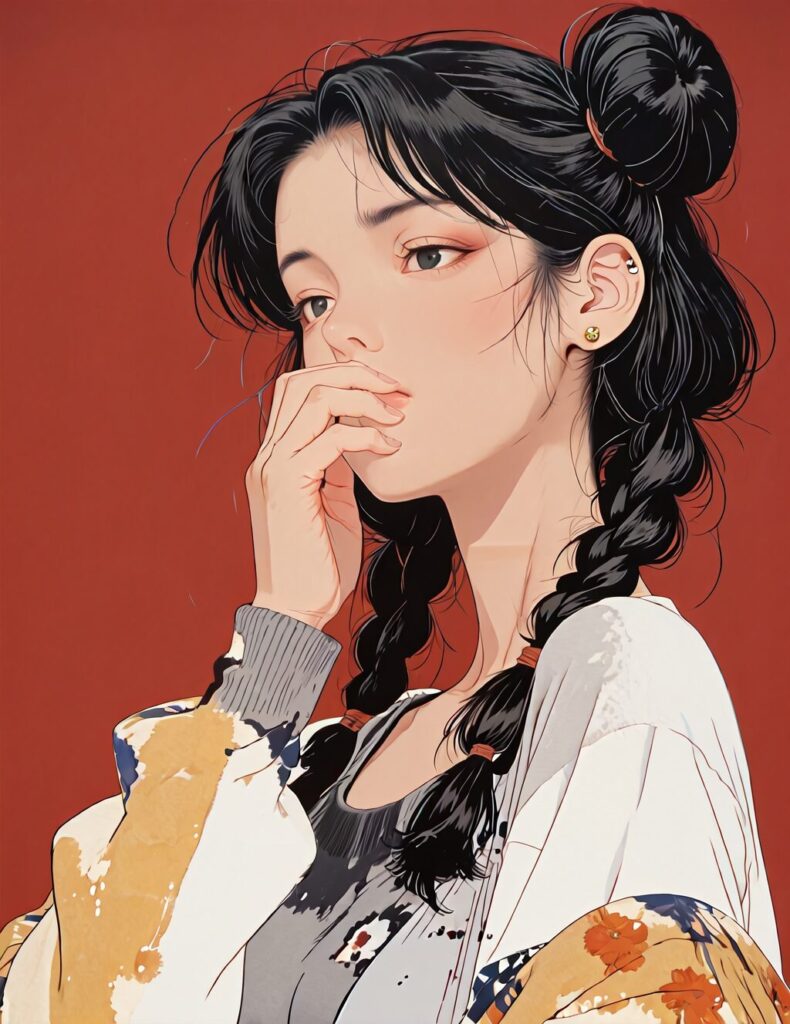rtro2, \(mature female\), 1girl, red background, solo, ear piercing, piercing, black hair, twin braids, black eyes, grey sweater, simple background, hair bun, double bun, braid, sweater, jewelry, earrings, black nails, looking at viewer, sleeves past wrists, covering own mouth, long hair, upper body, long sleeves, yellow jacket, nail polish, half-closed eyes, shirt, covered mouth, hand over own mouth, fingernails, cardigan, multiple braids, off shoulder, portrait, stud earrings, hand up, multiple earrings, jacket, grey shirt, open clothes, sleeves past fingers, open cardigan, dramatic light, amazing quality, best resolution, best detail, absurdres, newest, , NO_LORA <lora:retrovstyle:0.8>