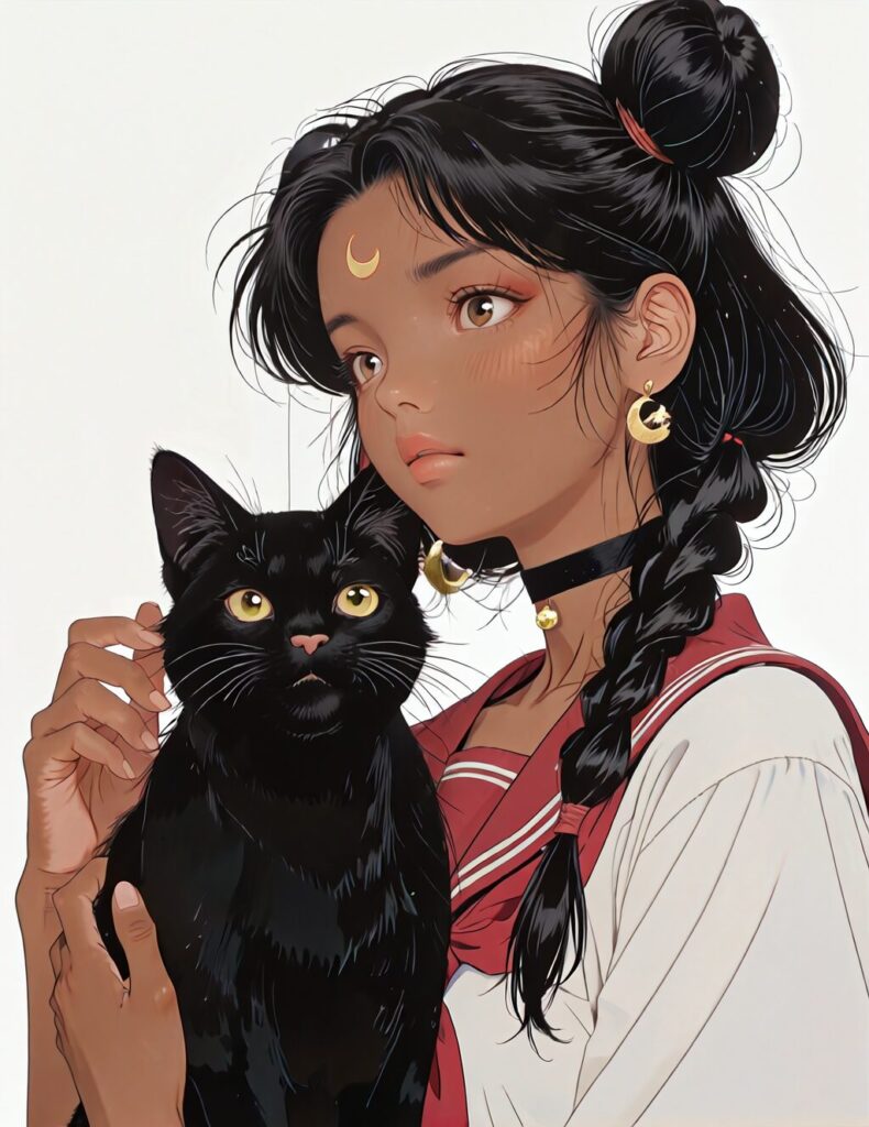 rtro2, \(three quarter view\), (from_above, from_side:0.3), 1girl, crescent facial mark, forehead mark, jewelry, black cat, crescent earrings, black hair, choker, single braid, hair bun, red sailor collar, looking at viewer, double bun, long hair, upper body, holding animal, brown eyes, school uniform, dark skin, dark-skinned female, hair over shoulder, bow, dramatic light, amazing quality, best resolution, amazing detail, absurdres, 4k, crisp, very awa, newest, ultra-HD, , NO_LORA <lora:retrovstyle:0.8>