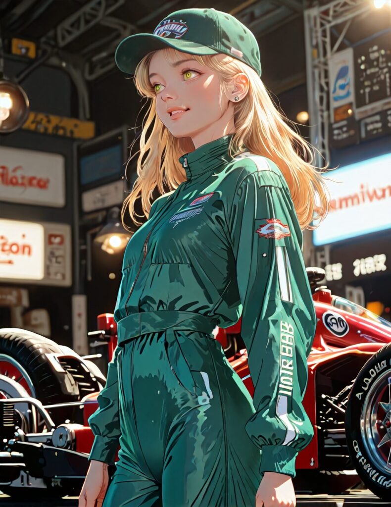 rtro2, \(three quarter view\), (from_above, from_side:0.3), 1girl, baseball_cap, green cap, blonde hair, thick eyelashes, parted lips, blurry background, cowboy shot, ear piercing, formula racer, from side, hat, jumpsuit, grin, thick eyelashes, teeth, small chest, long sleeves, long hair, looking to the side, yellow eyes, (racing suit), green jumpsuit, sidelighting, dramatic light, amazing quality, best resolution, amazing detail, absurdres, 4k, crisp, very awa, newest, ultra-HD,, NO_LORA <lora:retrovstyle:0.8>