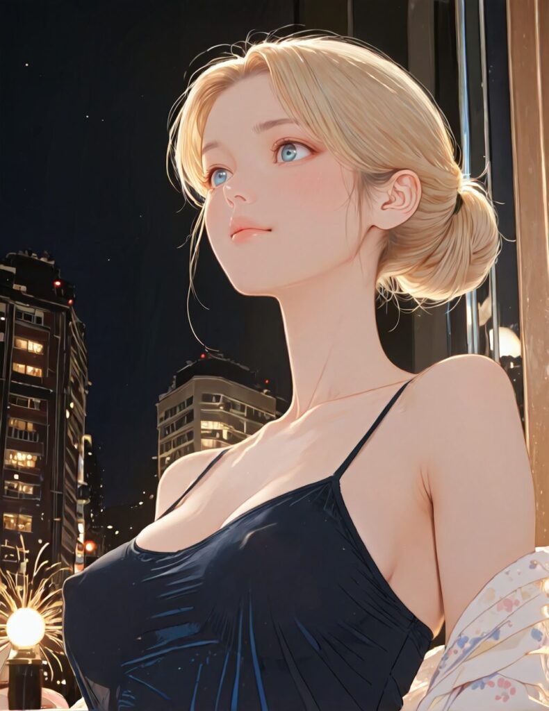 Portrait, waist-up low-light erotic portrait of the same adult woman, round cheeks, soft jaw, wide midface clearly preserved. She stands near a window at night, city lights diffused behind her, gaze heavy and deliberate. Wearing a silk camisole beneath an open shirt, fabric catching light and shadow across her skin. Expression calm, intimate, charged with quiet tension. No hands in frame, no explicit action only proximity and implication. ((erotic atmosphere:1.35)), ((true facial volume:1.4)), ((cinematic realism:1.3)) blonde-38 bright blue eyes erect nipples <lora:Blonde-38_PONY:0.8>