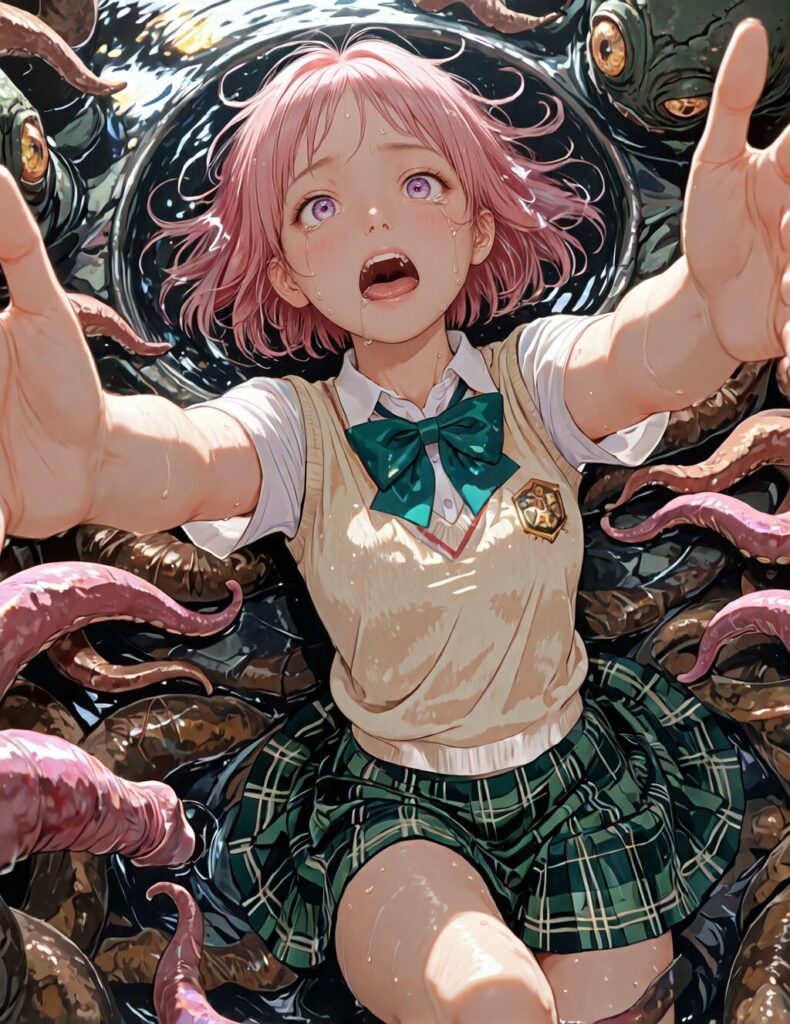 masterpiece,best quality,newest,general,solo,1girl,,d_i_t,extra eyes,tentacles,monster,indoor,wet,lying, open mouth,saliva, fantasy,<lora:Fixhands_anime_bdsqlsz_V1:1>,tears,dashed eyes,panicking,gasping,reaching towards viewer,looking_at_viewer,leg grab, pink hair,purple eyes,short hair,m_clothes,green bowtie,sweater vest,short_sleeves,green plaid skirt,gasping,on stomach, <lora:draw_in_t_ilxl_v1.4:0.7>
